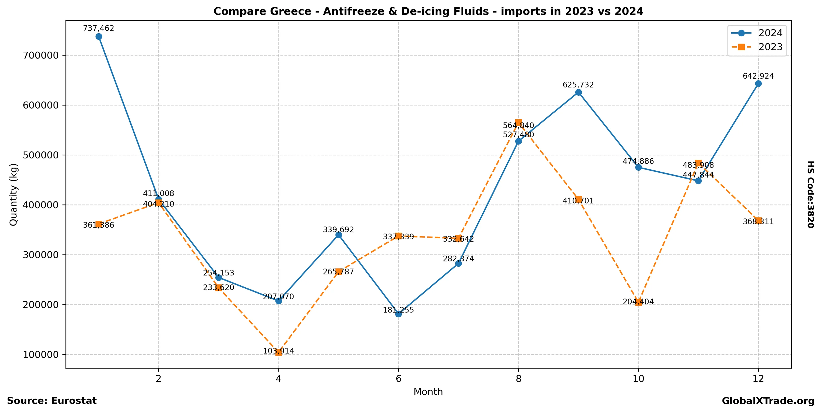 A rise in Greek imports of antifreeze and de-icing fluids is largely attributed to winter season demand, which has seen an uptick as temperatures drop. This trend is consistent with previous years and reflects the country’s continued reliance on imported products in this sector due to domestic production constraints. Additionally, global market prices for these chemicals have remained relatively stable, despite some minor fluctuations resulting from ongoing supply chain disruptions.