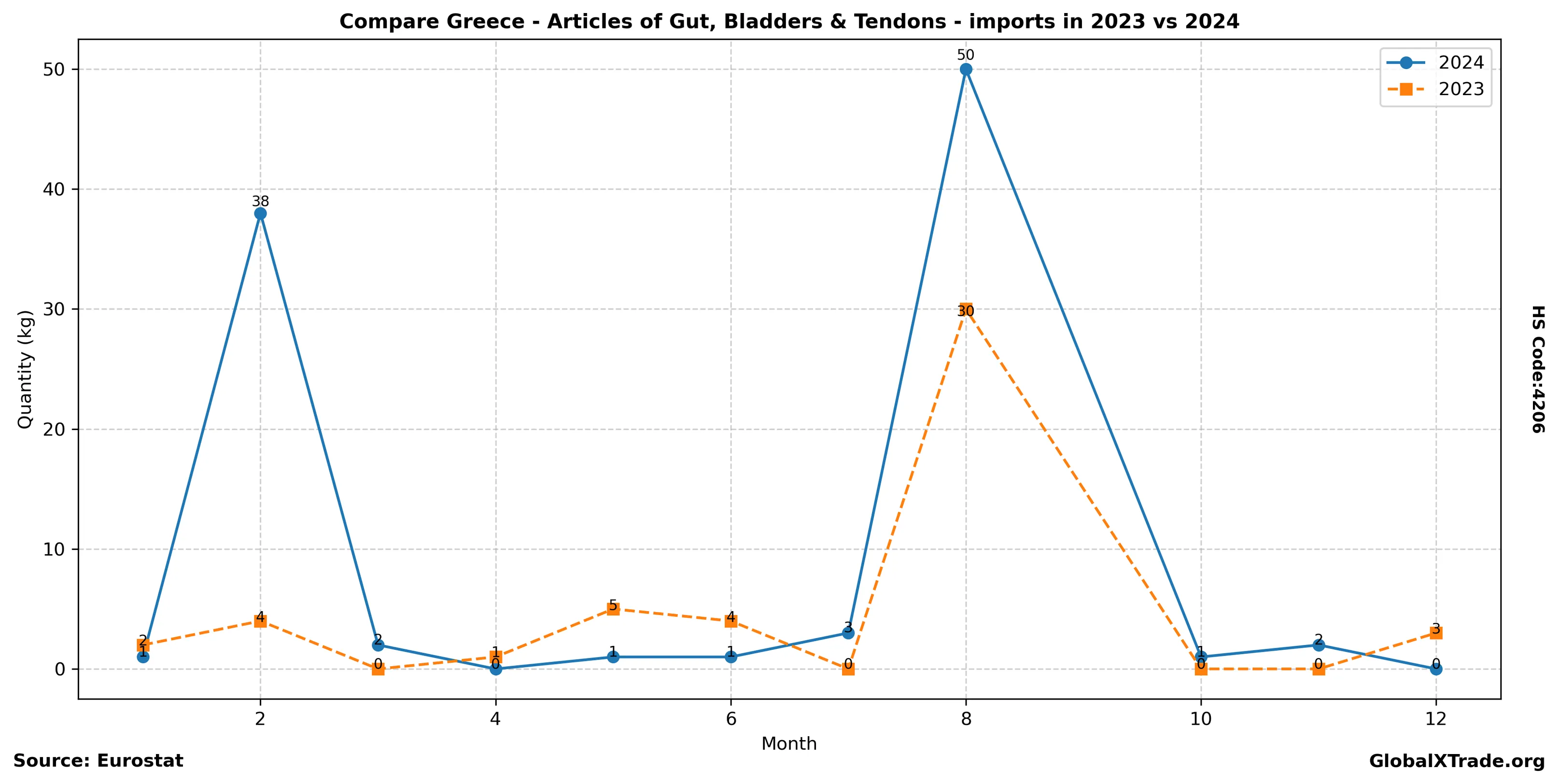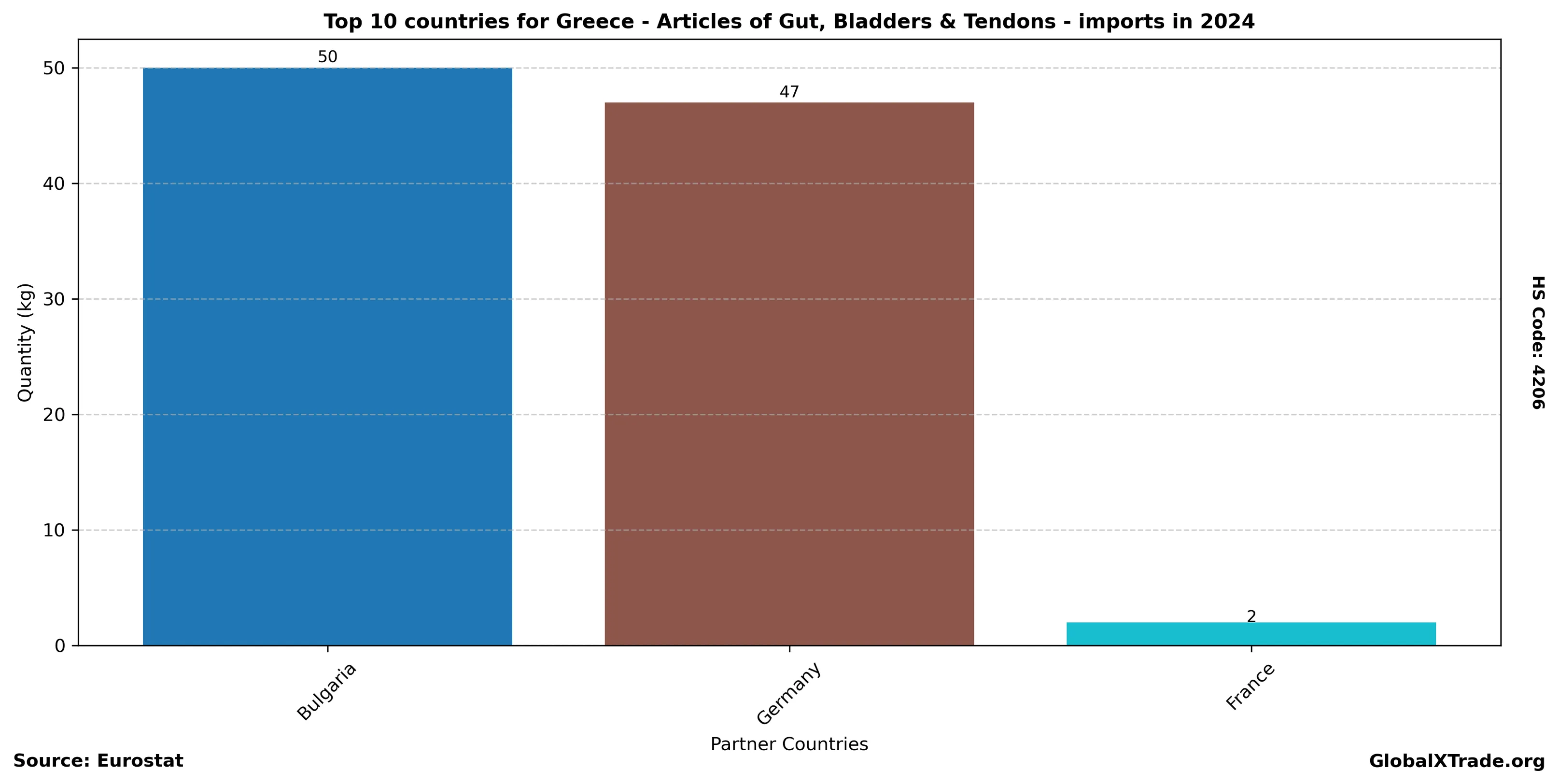 • Greek imports of articles of gut, bladders & tendons (HS Code 4206) increased by 12.5% in June compared to the same period last year.