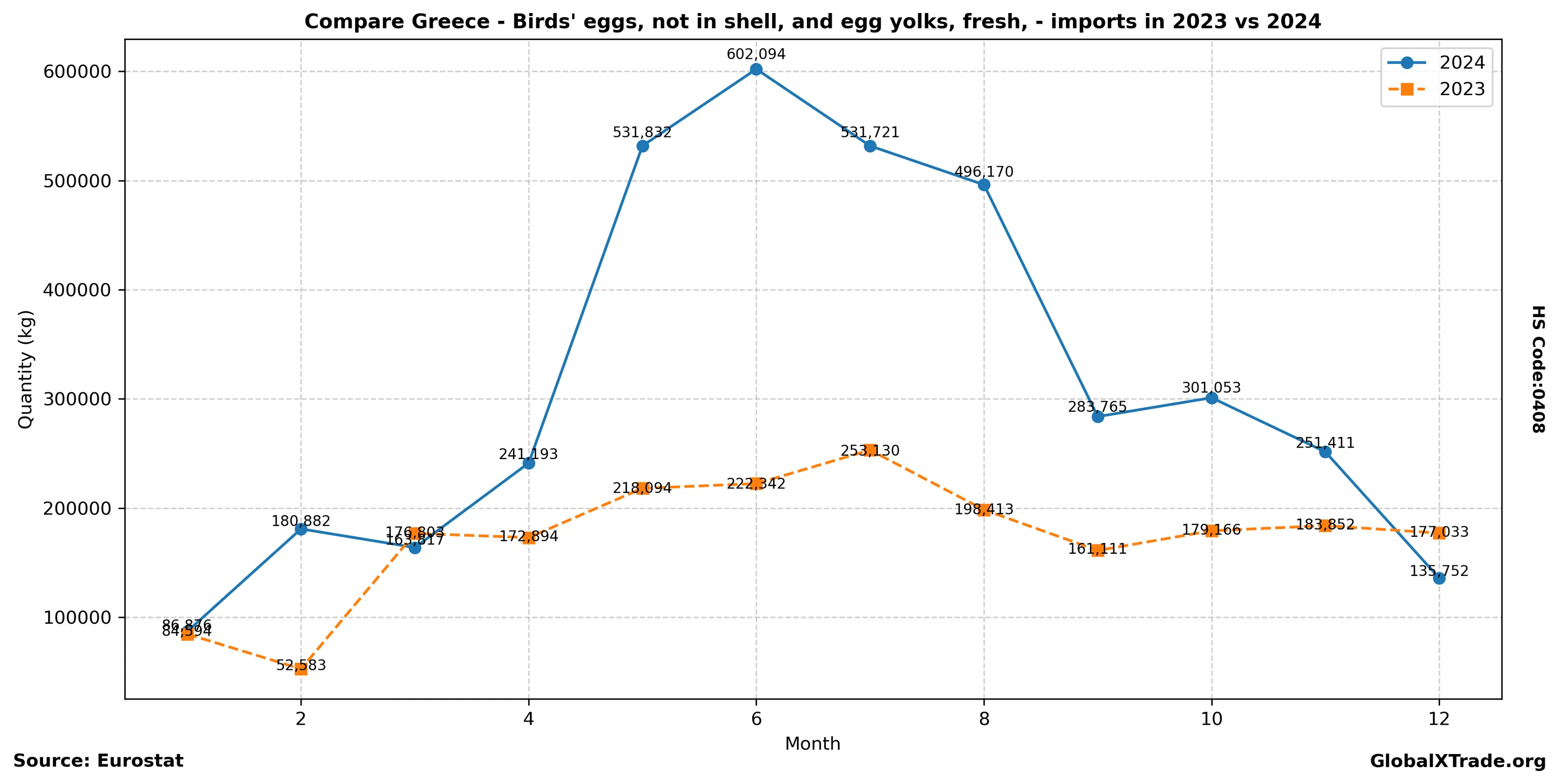 Greece’s imports of birds’ eggs not in shell have risen this year as domestic producers face challenges from rising feed costs and logistical issues. The uptick is largely driven by increased demand from the European Union’s food processing sector, which relies heavily on these products for production. Industry insiders expect this trend to continue through the summer months due to peak season demand.