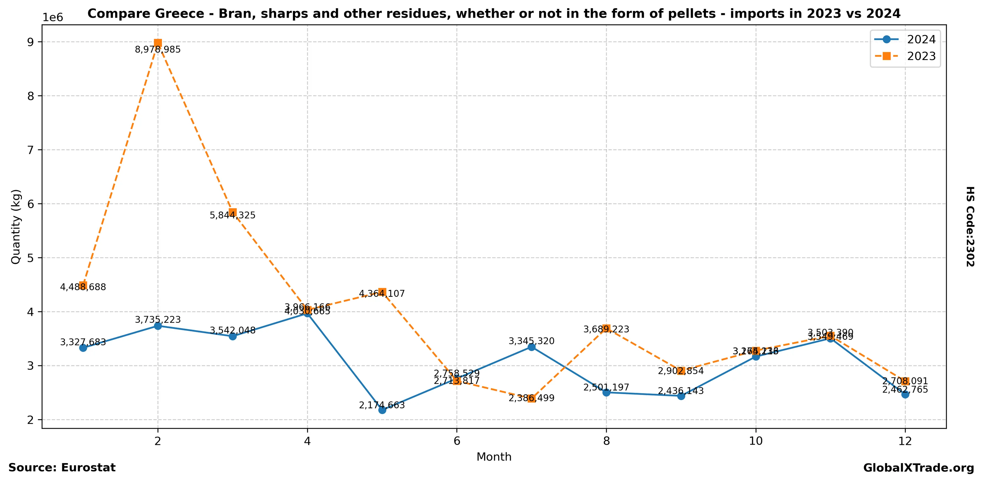 • The Greek Ministry of Development reported a 12% increase in imports of animal feed residues (HS Code 2302) from January to June compared to the same period last year.