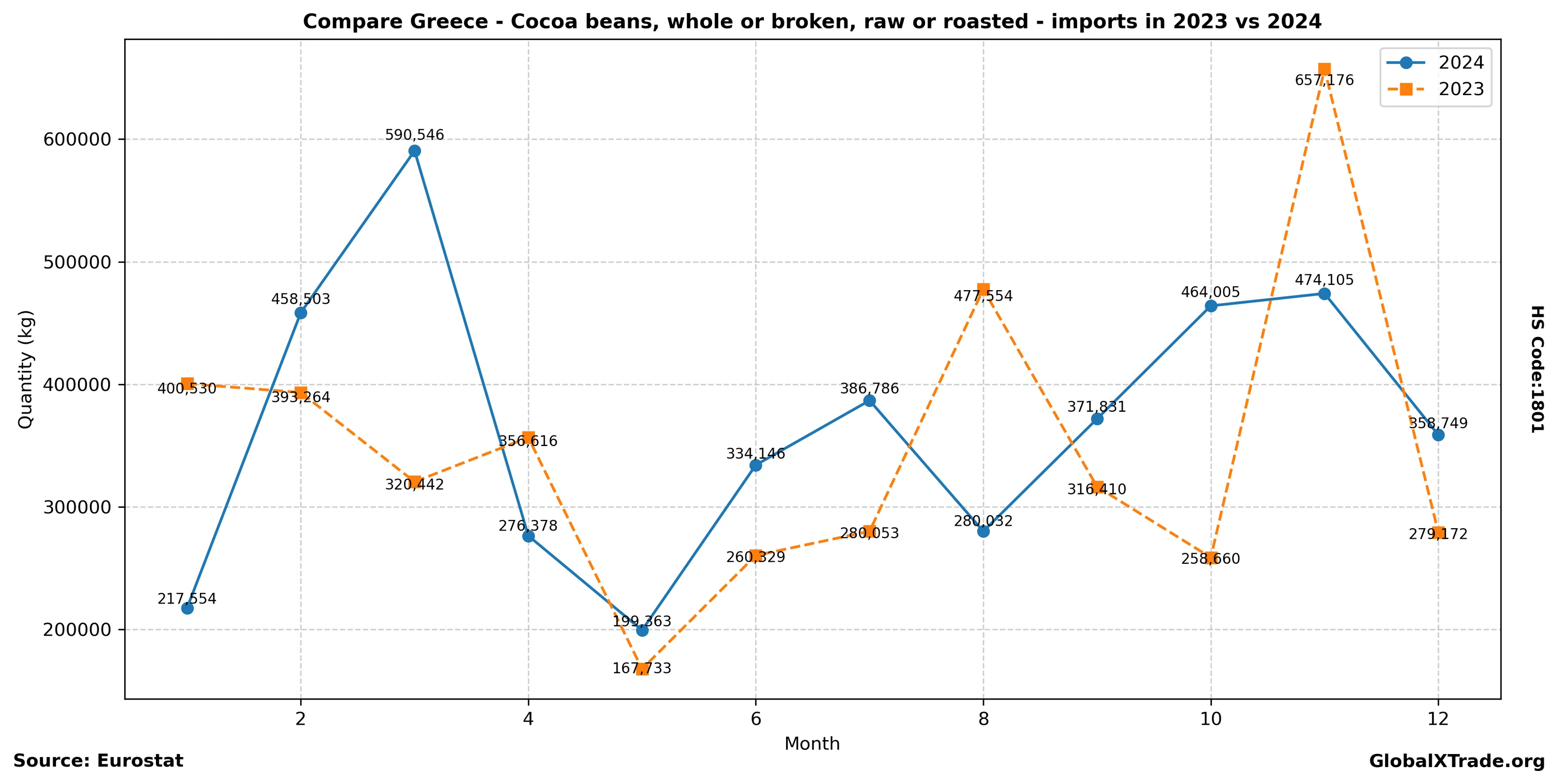 Greece “Cocoa beans, whole or broken, raw or roasted” Imports in 2024