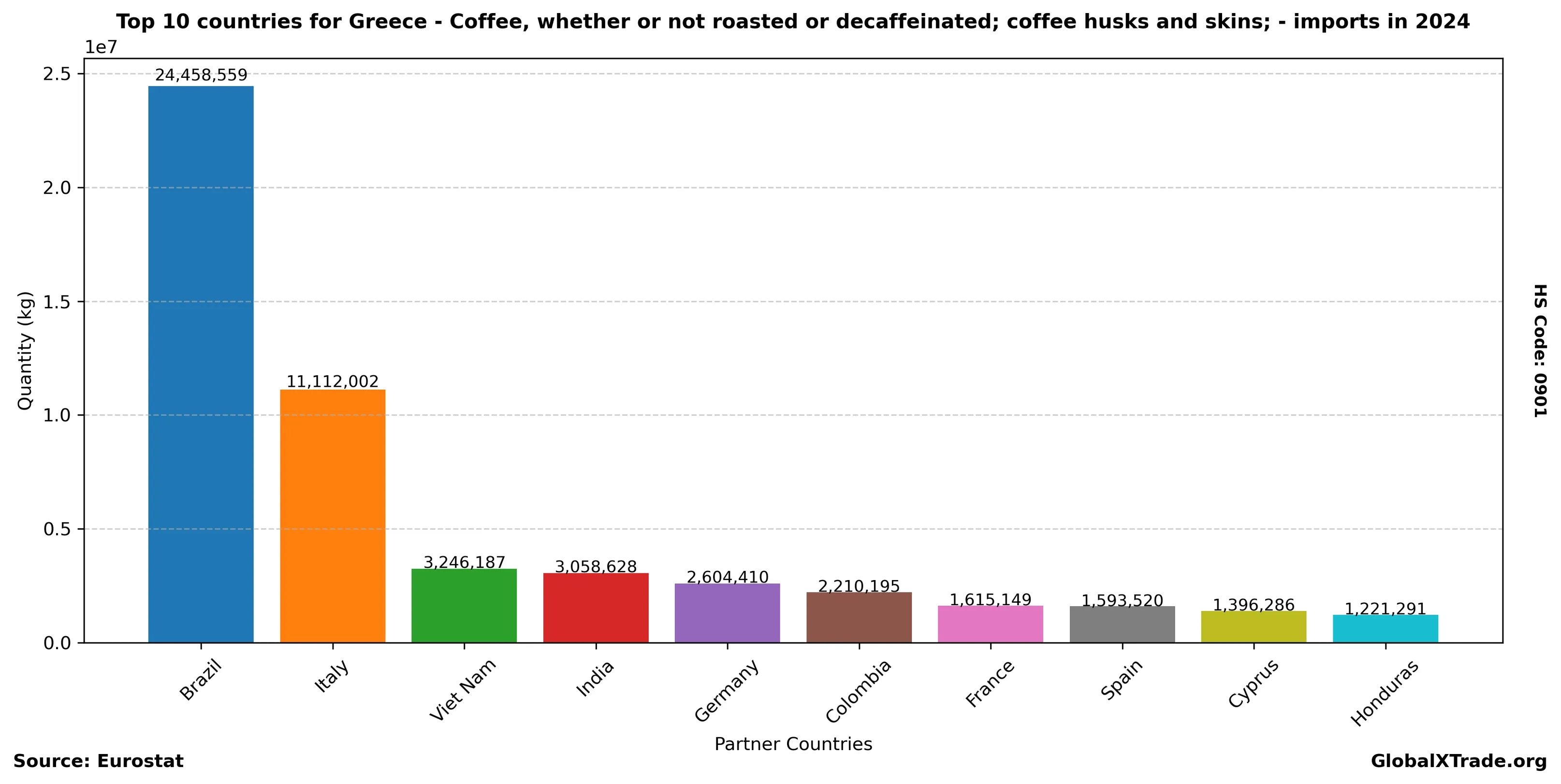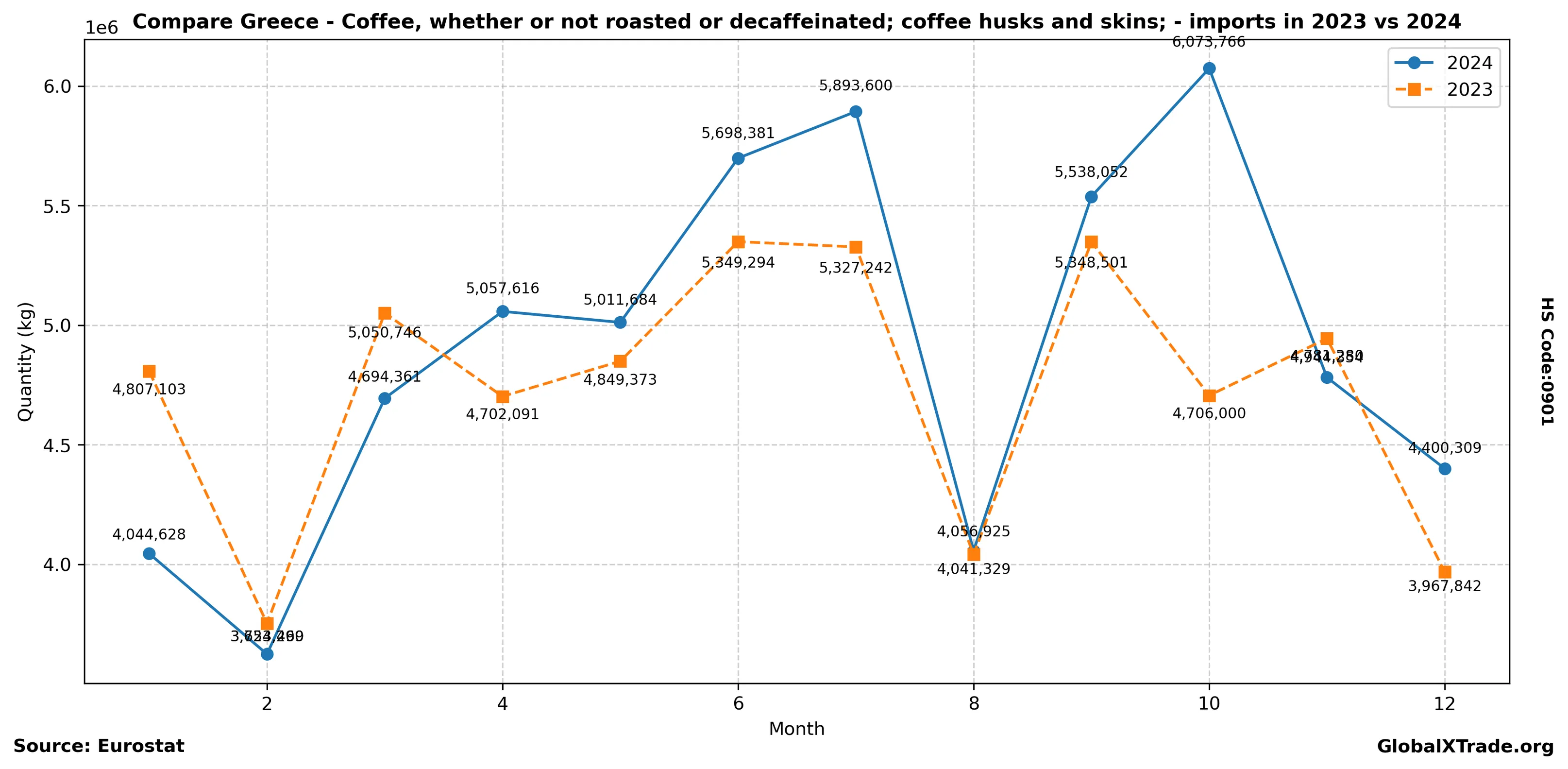 Greece “Coffee, whether or not roasted or decaffeinated; coffee husks and skins;” Imports in 2024