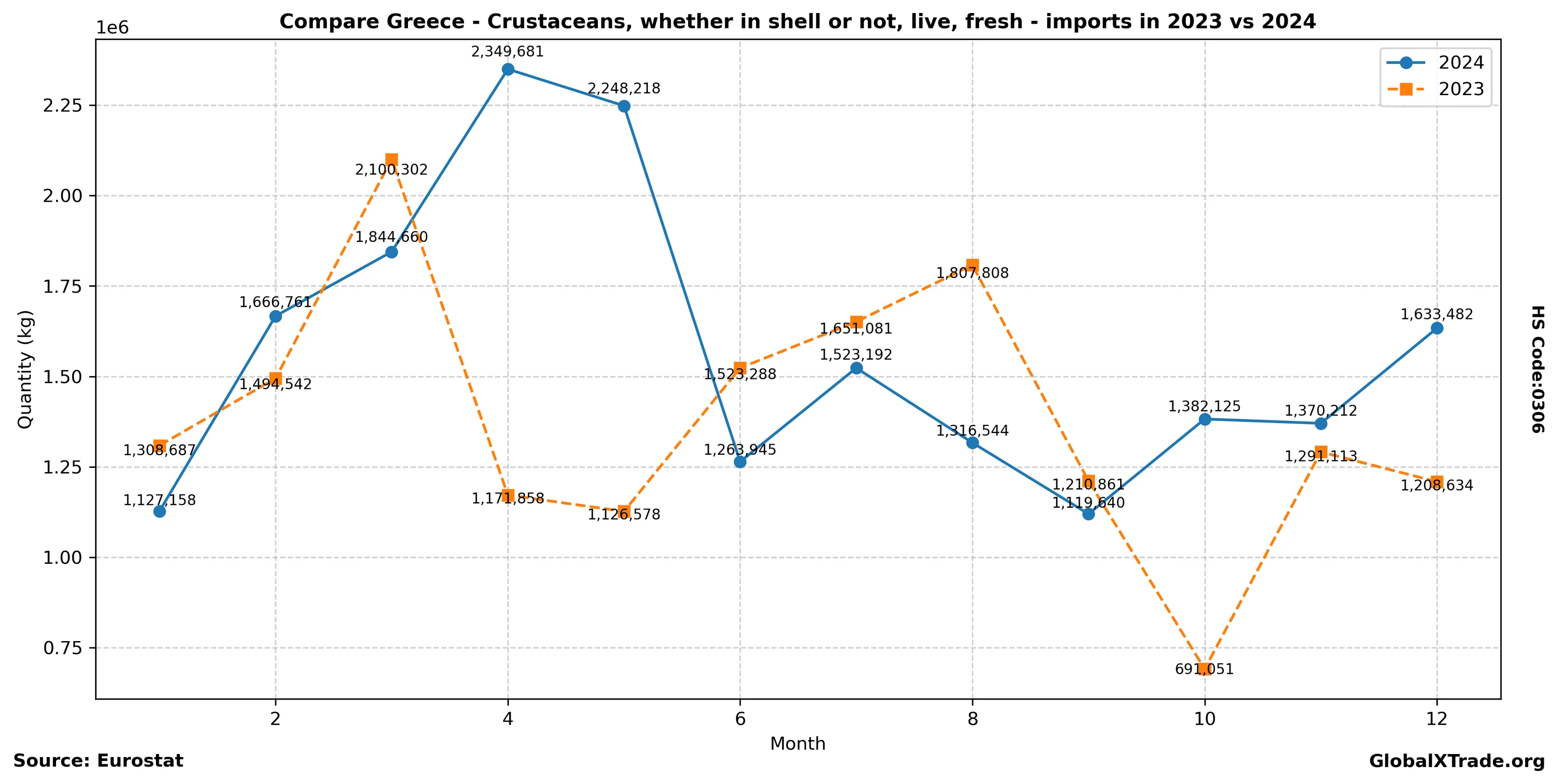 * Greece’s imports of live crustaceans, including crabs, rose 15% year-over-year in June to 1,200 metric tons.