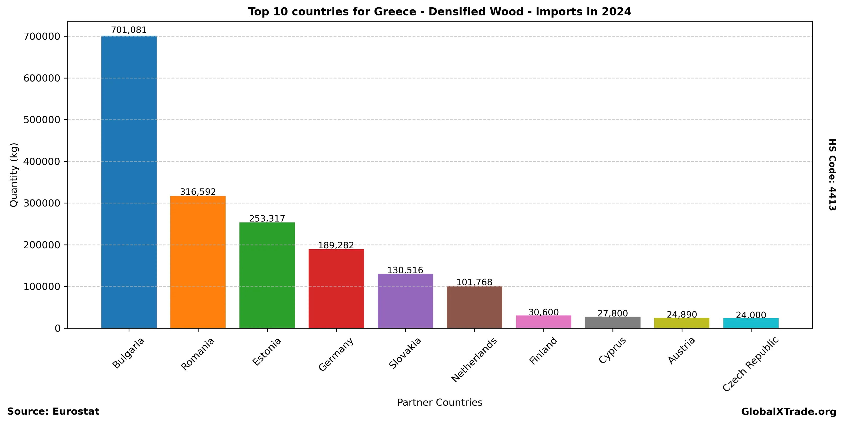 • Greece’s imports of densified wood (HS 4413) rose 12% in May, driven by growing demand from the country’s furniture and construction sectors.