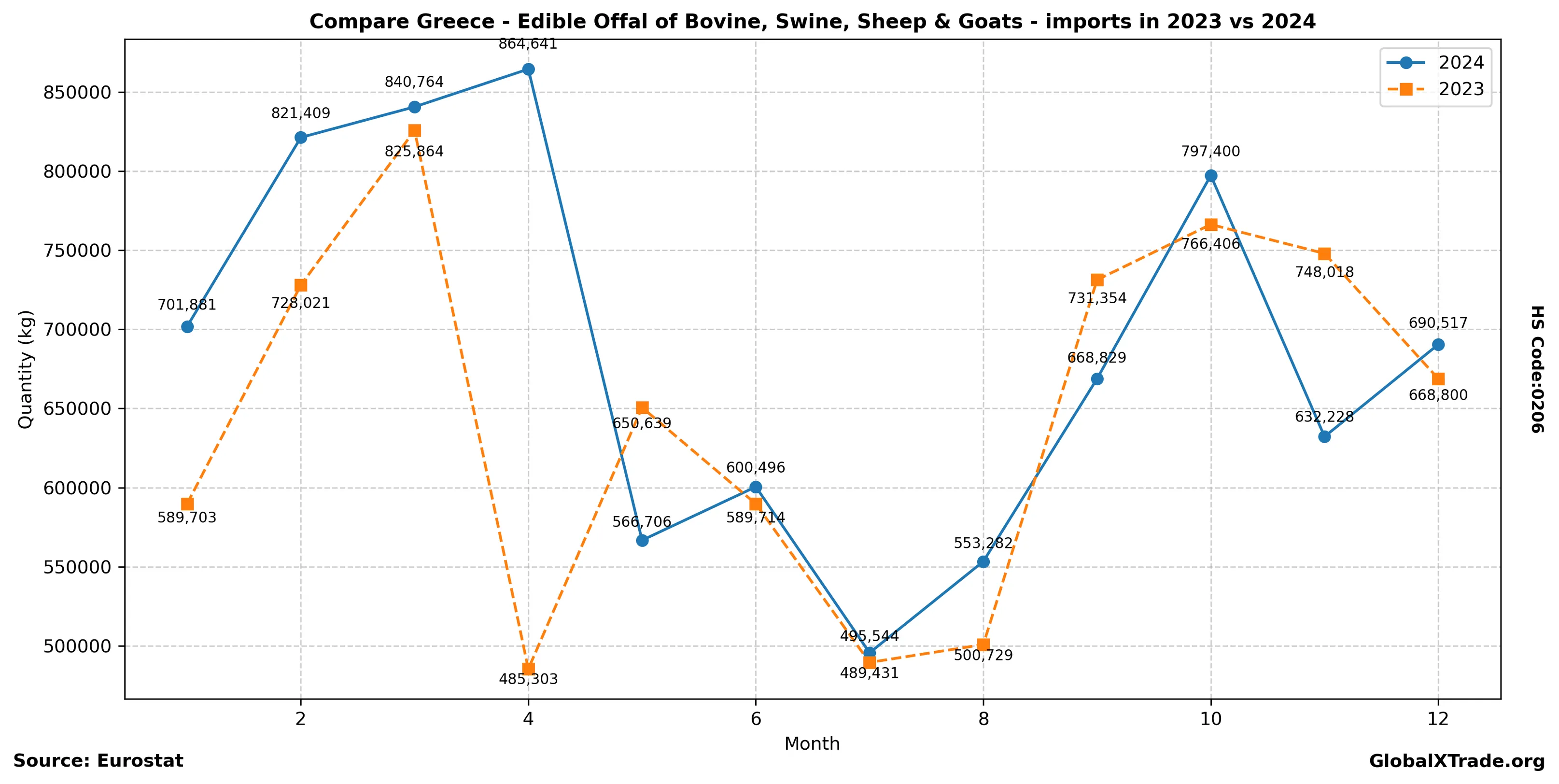 Greece’s import growth in edible animal by-products is consistent with seasonal trends, as consumers tend to favor meat products during the summer period. The increase in demand has led to a corresponding rise in imports from EU countries, where prices have remained relatively stable despite a slight decline in recent months.
