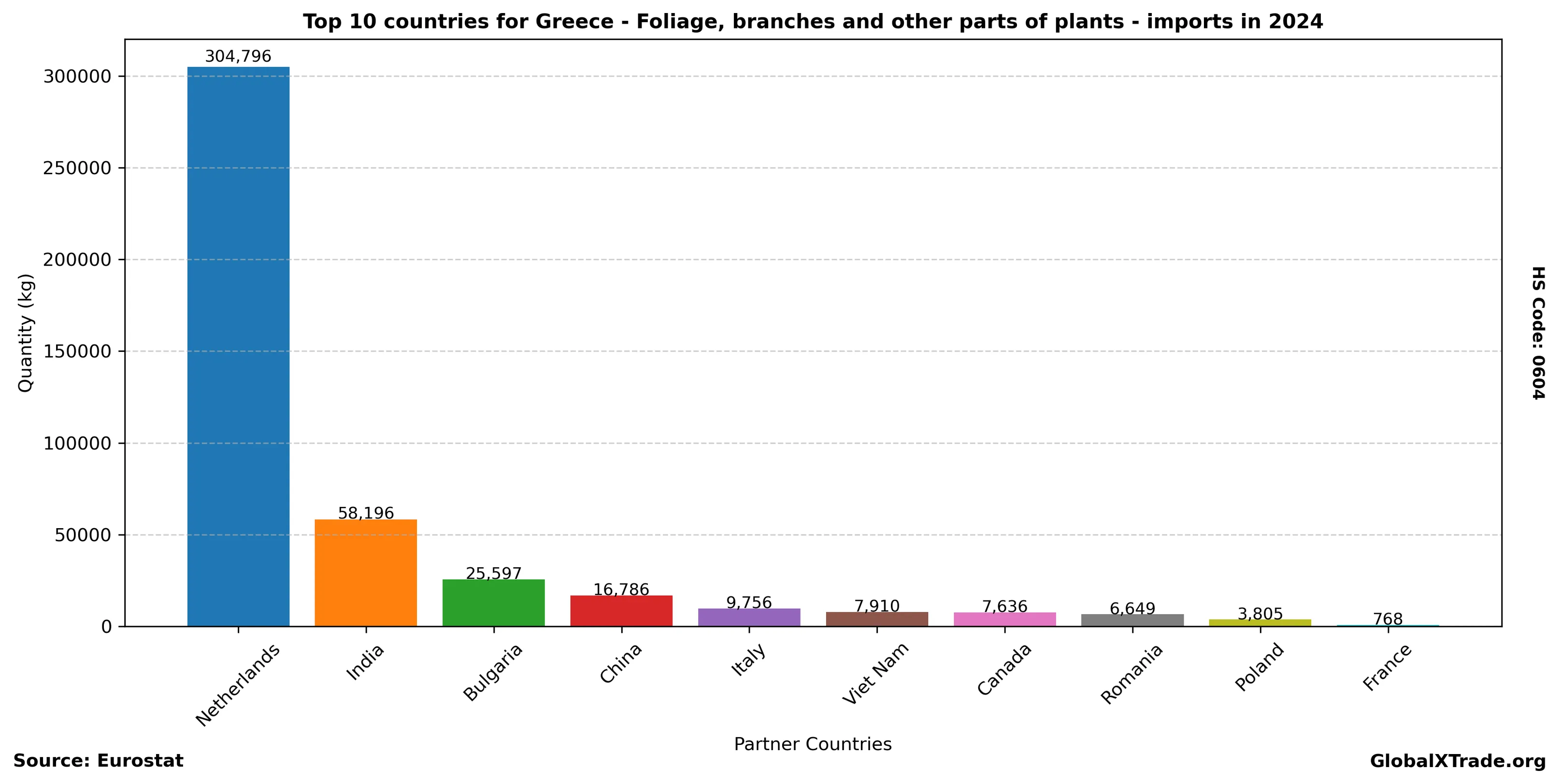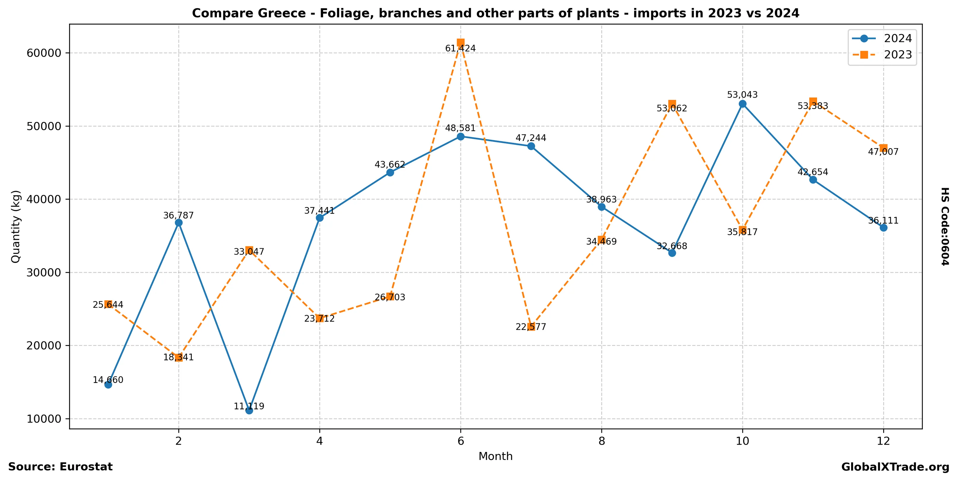 • Greek imports of foliage, branches and plant parts rose 12% year-over-year to 10.3 million kg in June.
