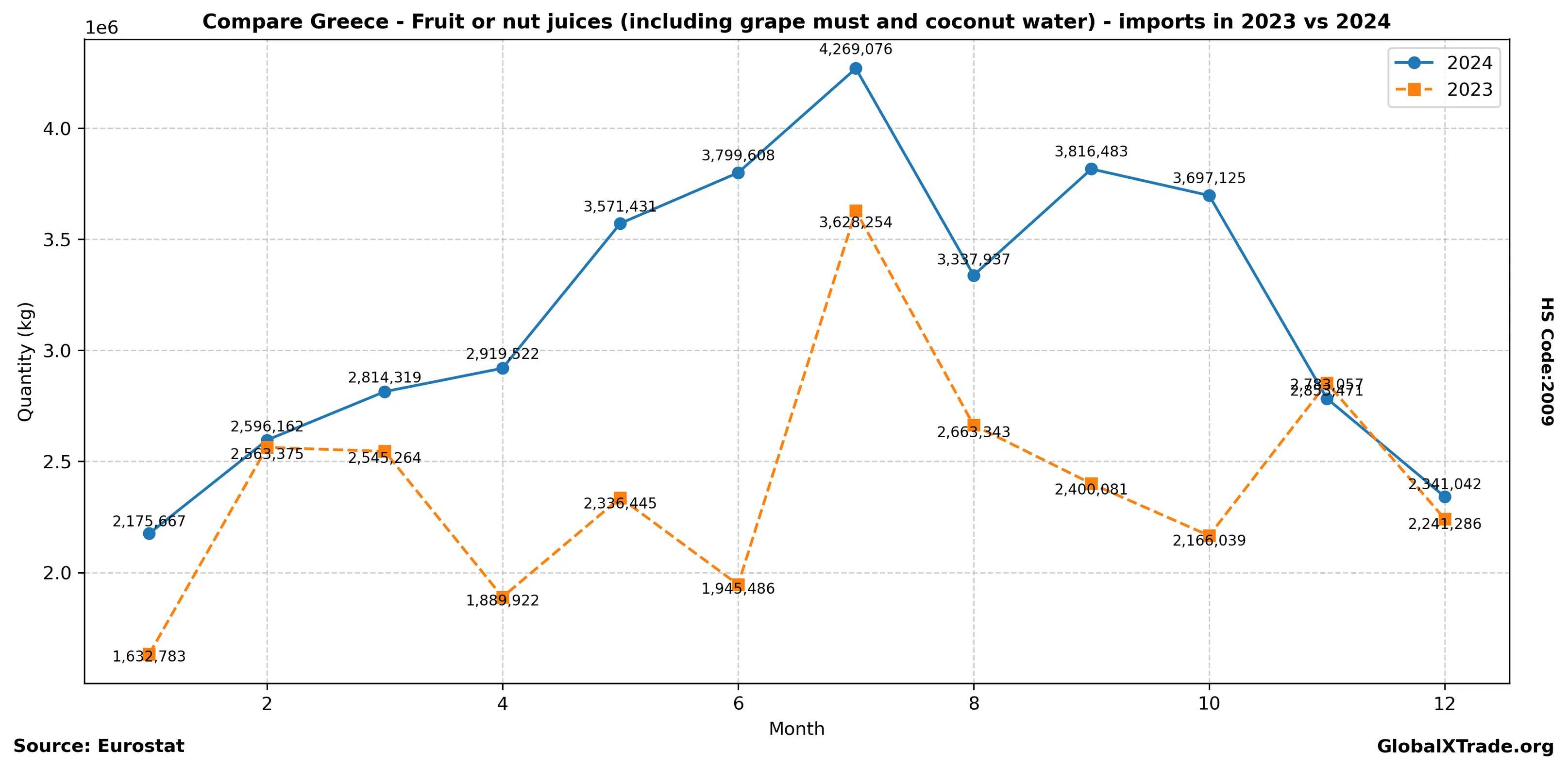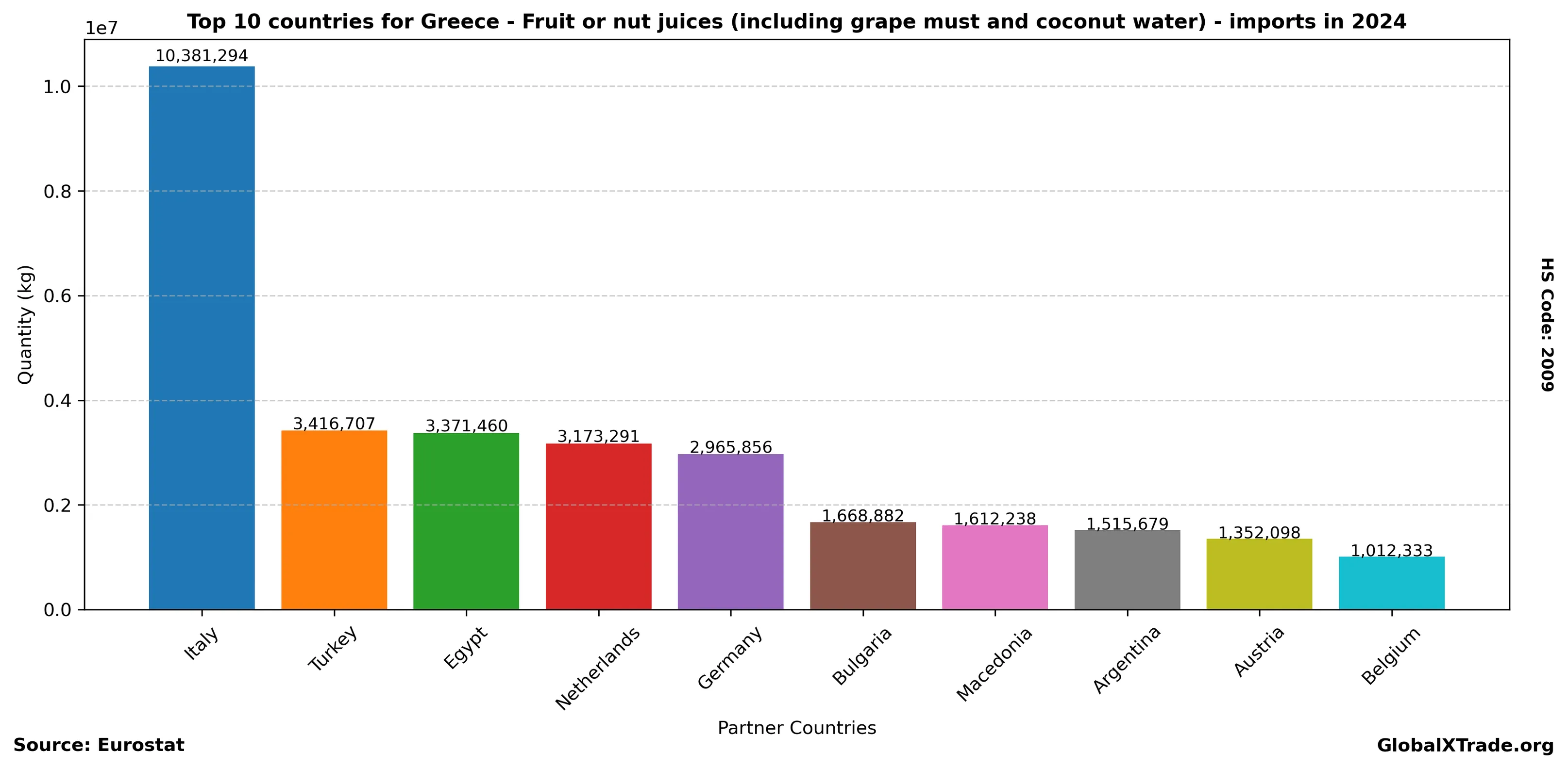 Greece “Fruit or nut juices (including grape must and coconut water)” Imports in 2024
