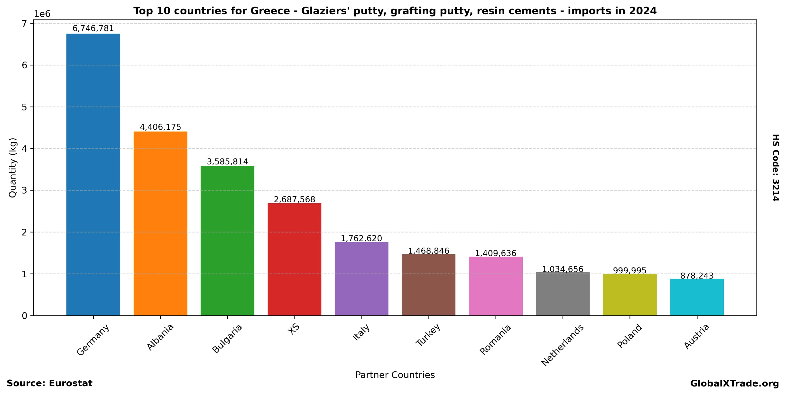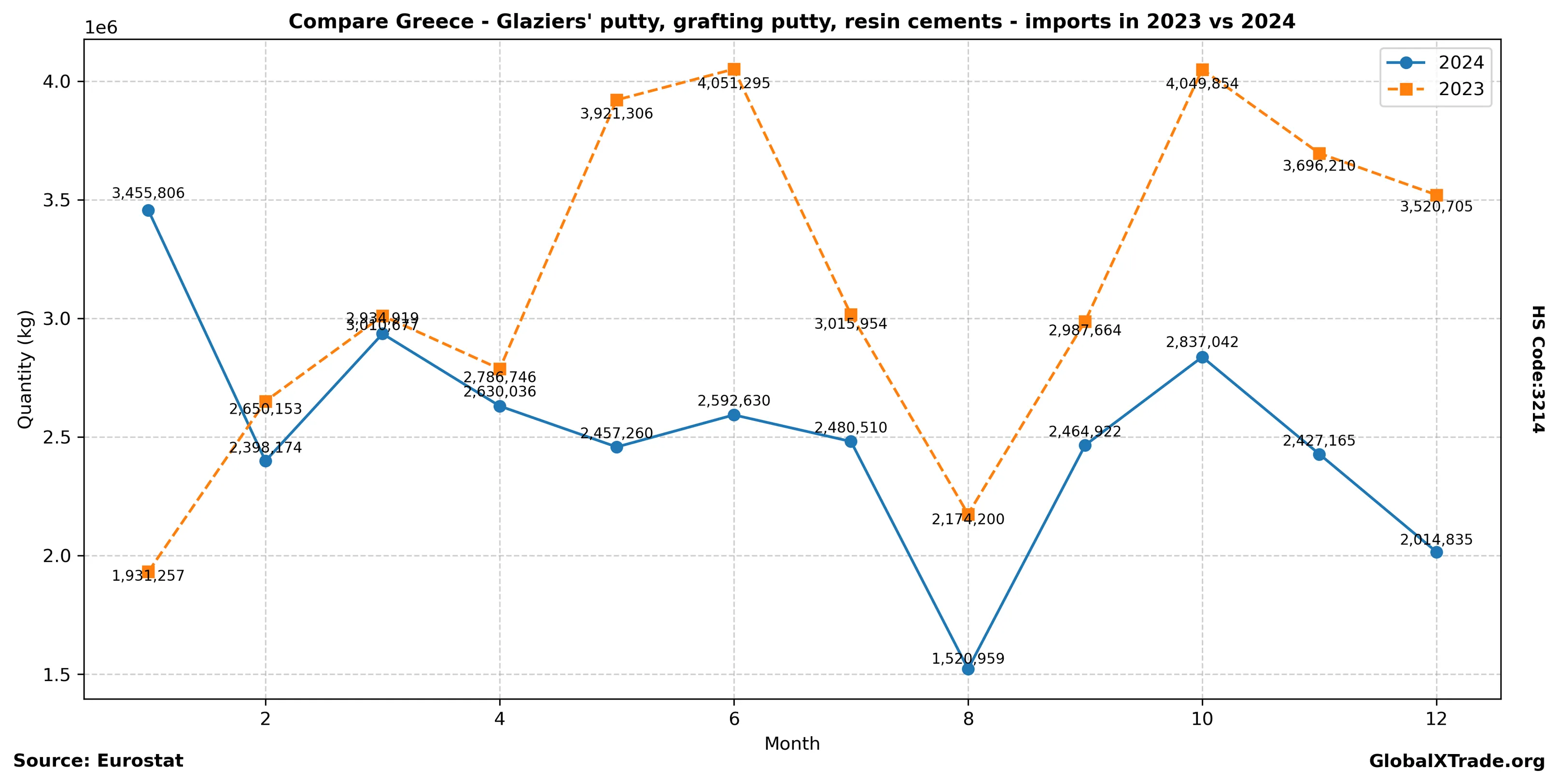 • Greek imports of HS Code 3214 increased by 12.5% year-over-year in the second quarter.