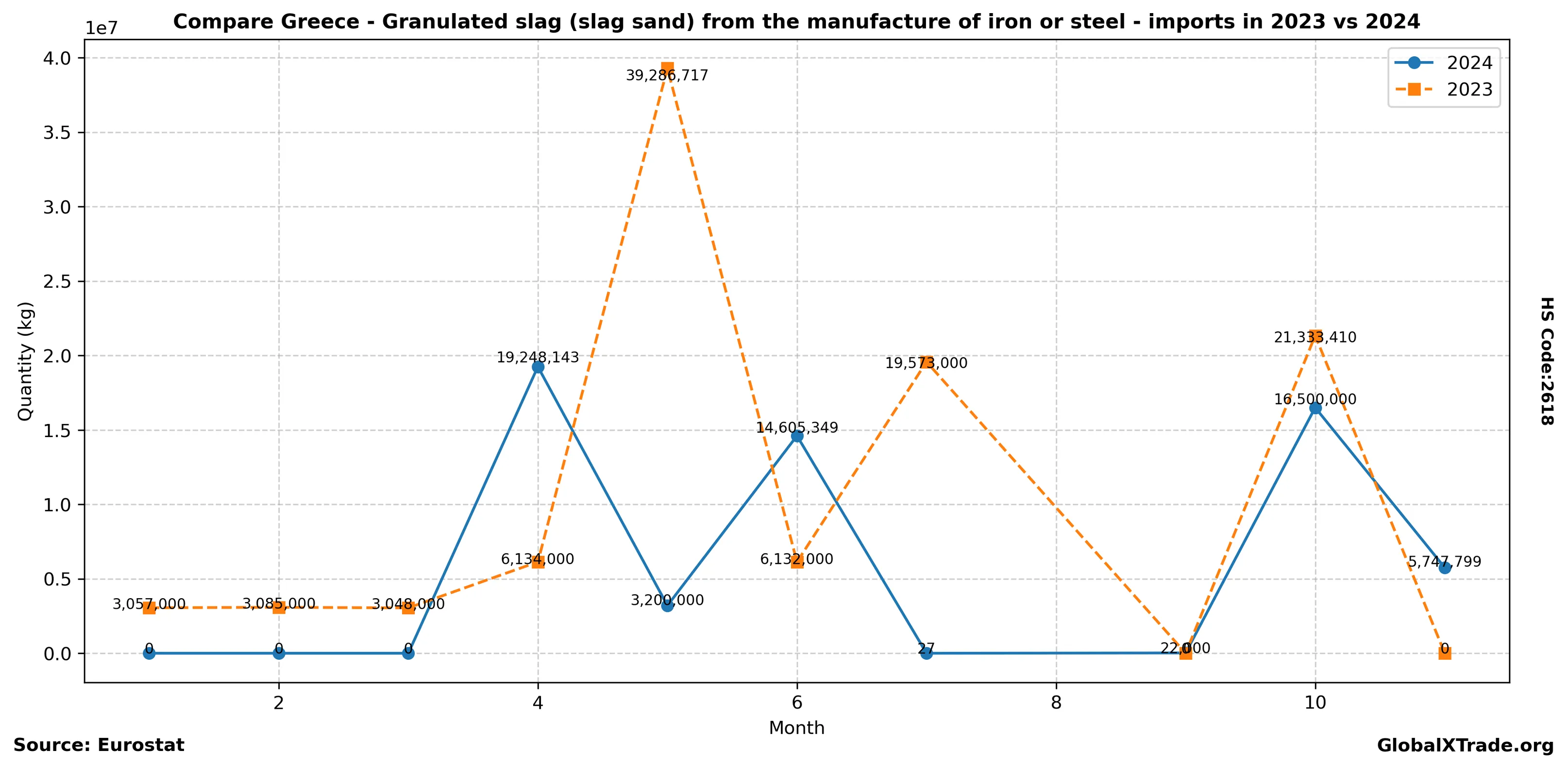 • Greece’s imports of granulated slag (HS Code 2618) increased by 15% in the first half of 2024 compared to the same period last year.