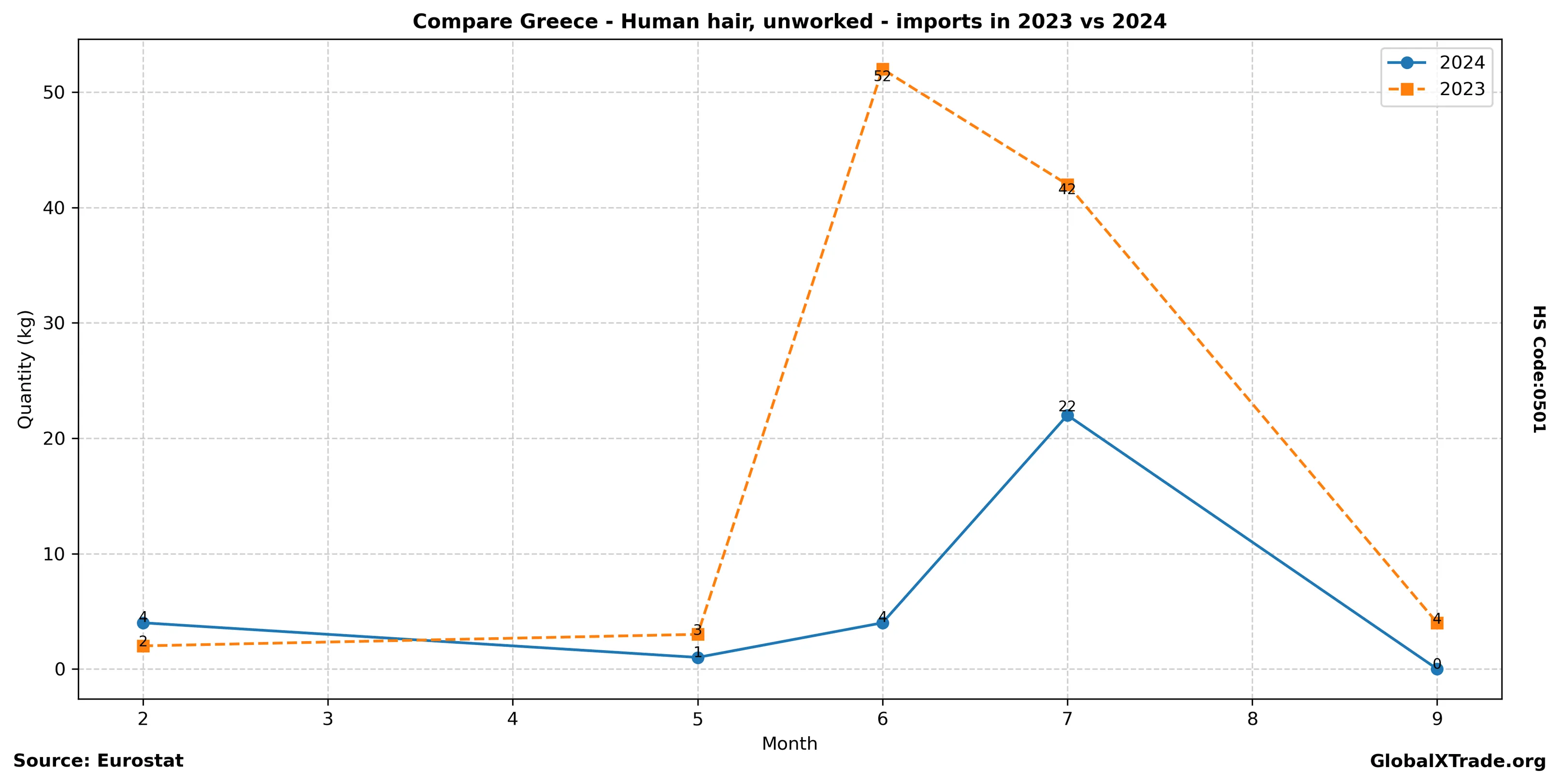 • The value of Greece’s human hair imports increased by 15% year-on-year to $12 million in the first half of 2023.