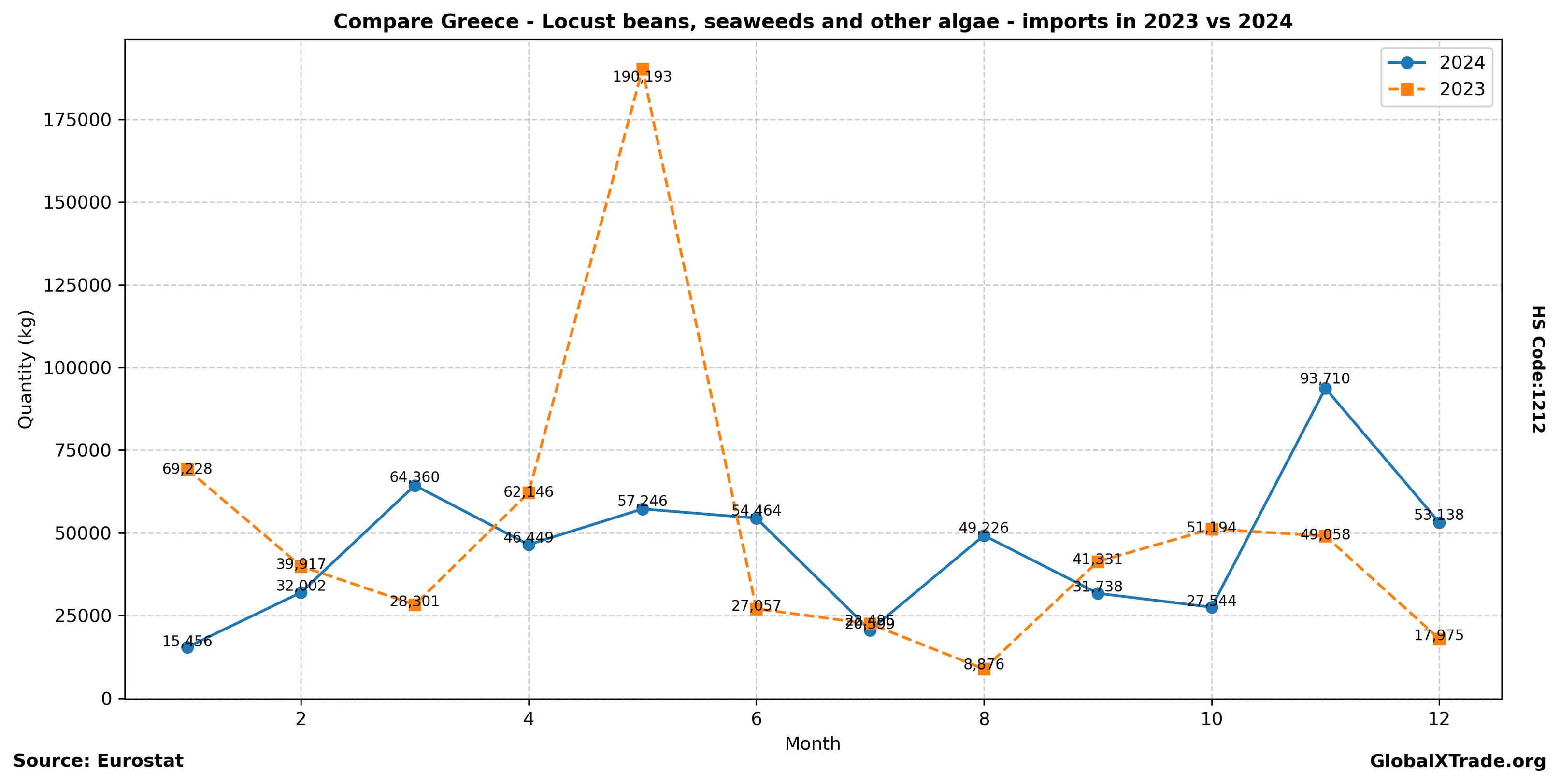 • Greece imported 10,500 metric tons of locust beans, seaweeds and other algae in June, up 12% from the same month last year.