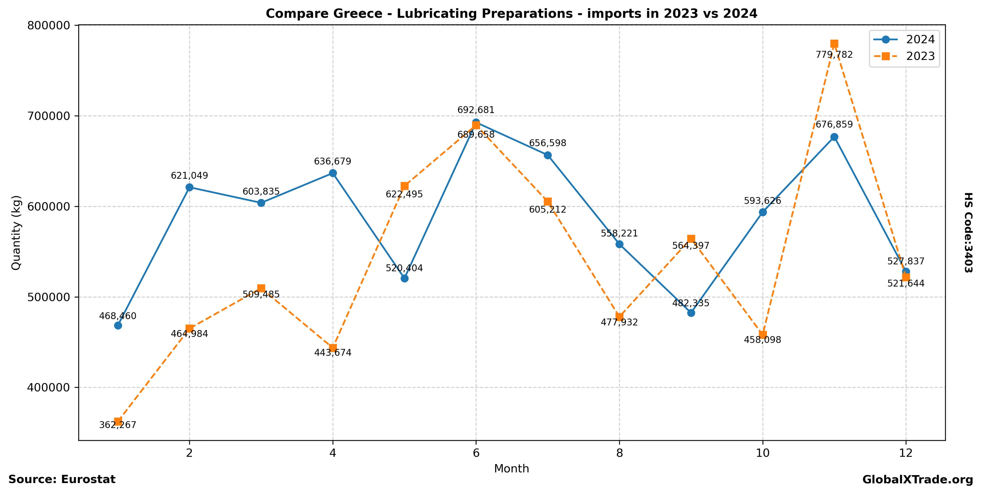 • Greek imports of lubricating preparations (HS Code 3403) rose 4.5% to 12,000 tonnes in June from the same period last year.