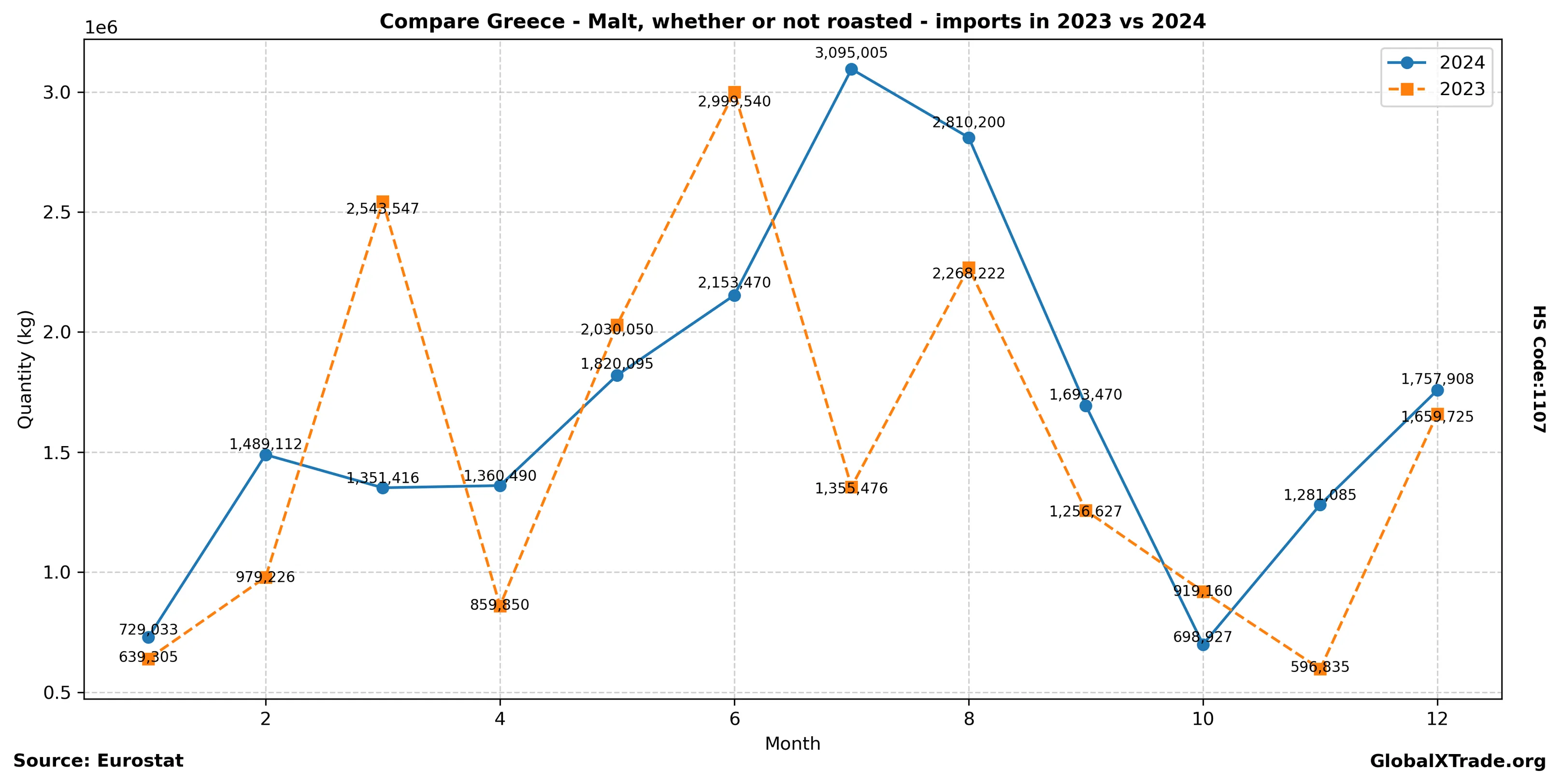 • Imports of malted barley into Greece rose by 15% year-over-year in June.