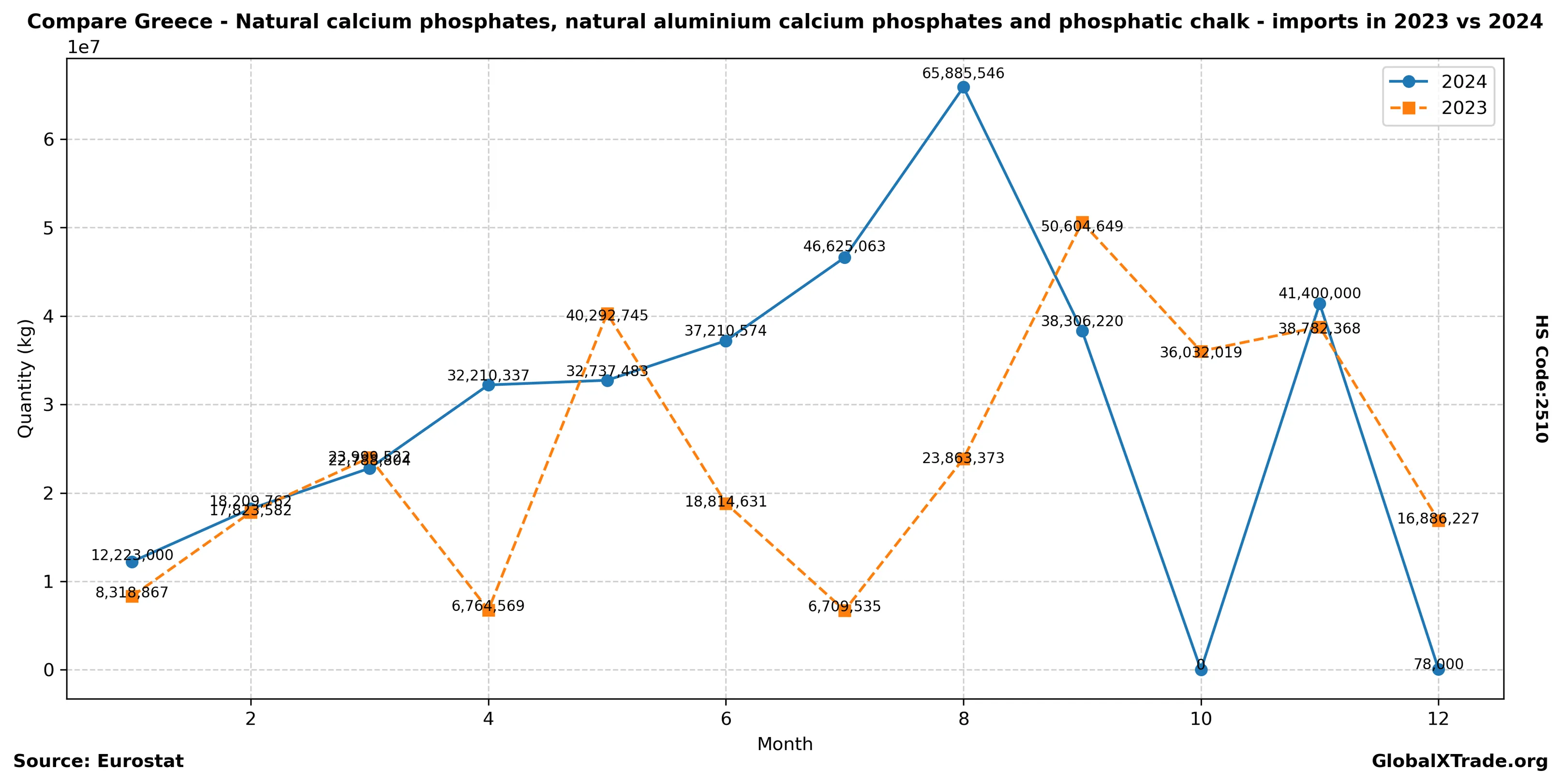 • Greek imports of natural calcium phosphates (HS Code 2510) rose by 4.5% year-over-year in June, reaching 12,100 tonnes.