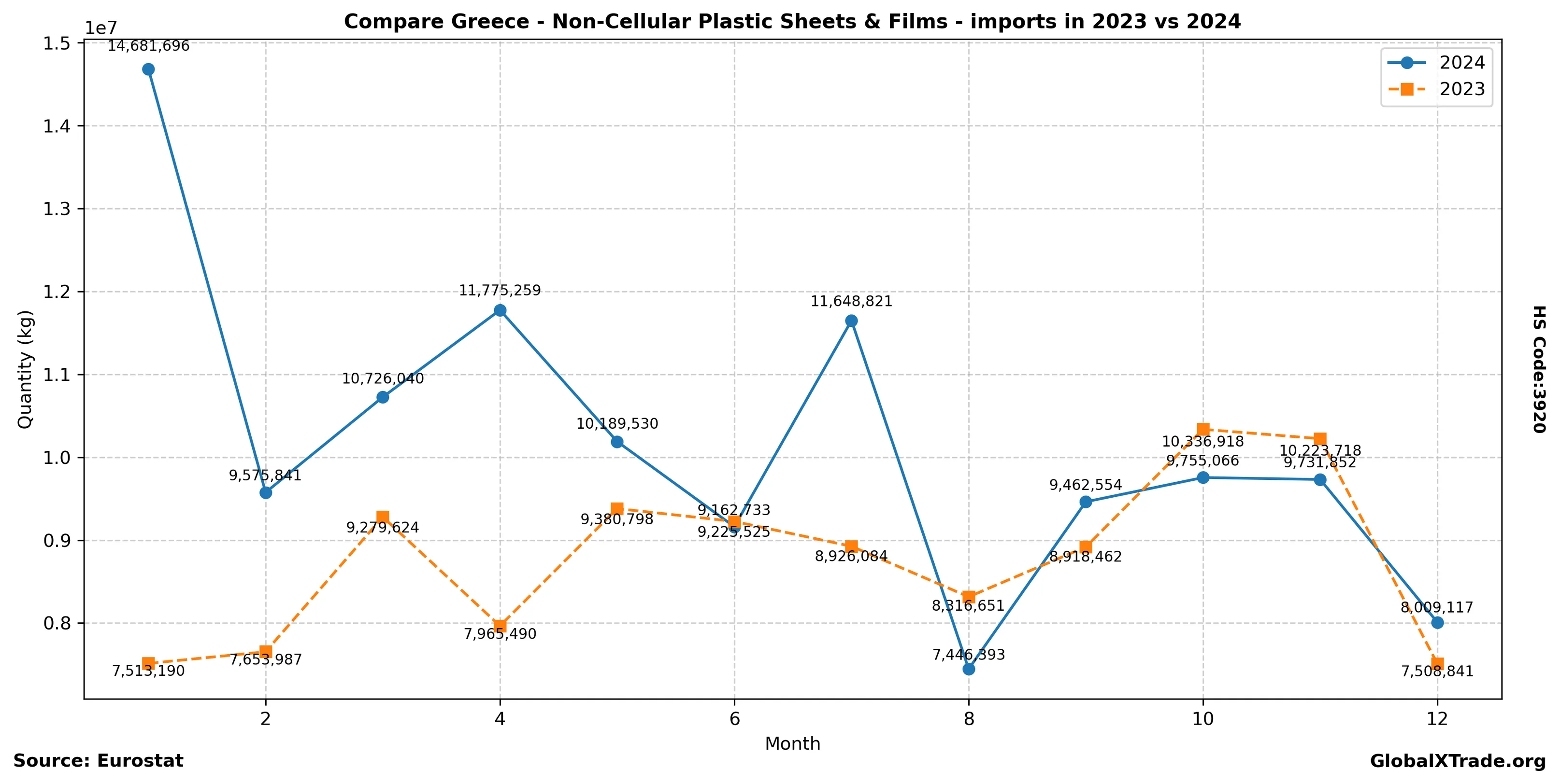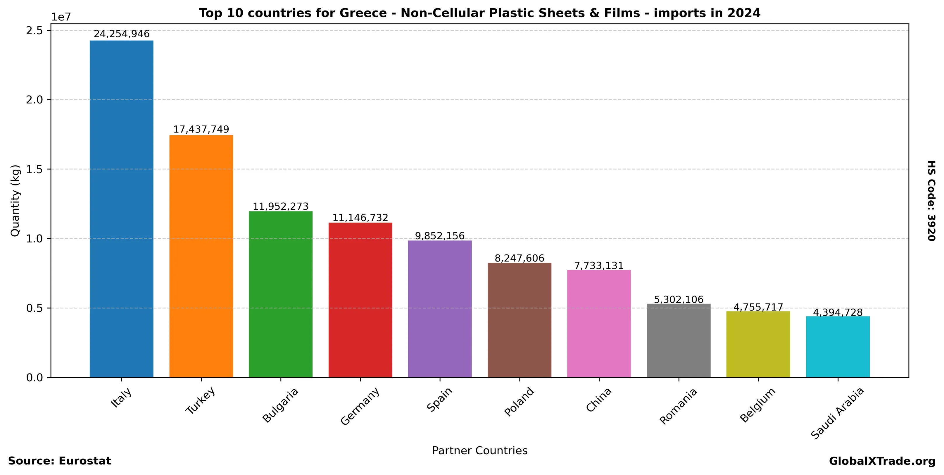 Greece “Non-Cellular Plastic Sheets & Films” Imports in 2024