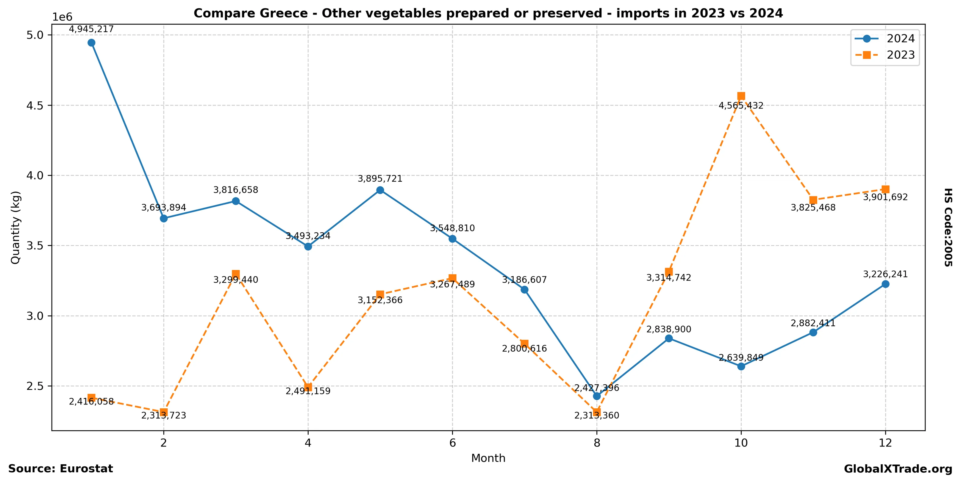 Greece’s imports of prepared vegetables continued their upward trend in June, benefiting from strong demand ahead of the peak summer season. Exporters in major European markets are taking advantage of favorable market conditions to boost shipments. Although average prices have stabilized, traders expect a slight increase in the coming months due to the approaching harvest season and potential supply chain disruptions.