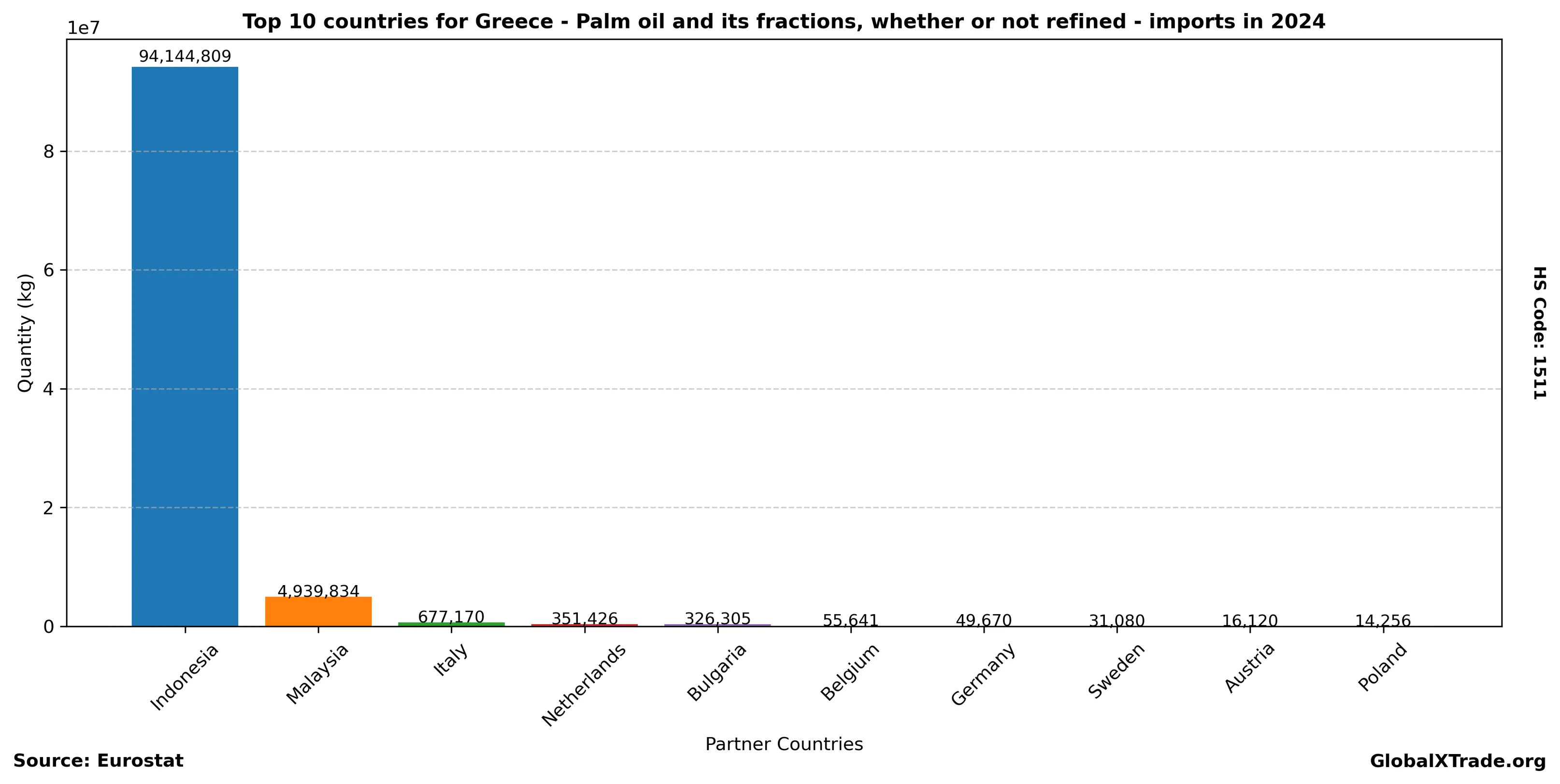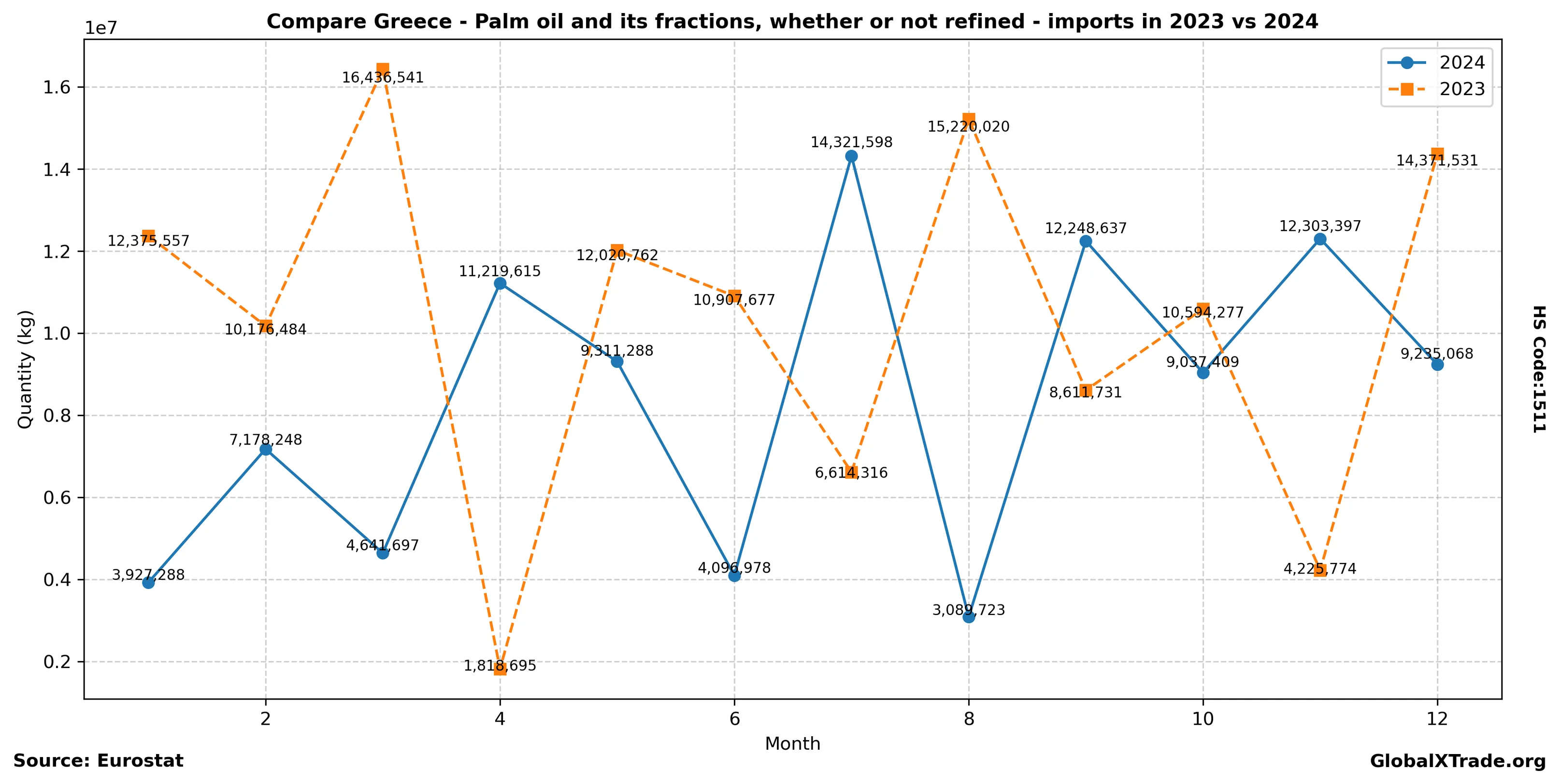 Greece “Palm oil and its fractions, whether or not refined” Imports in 2024