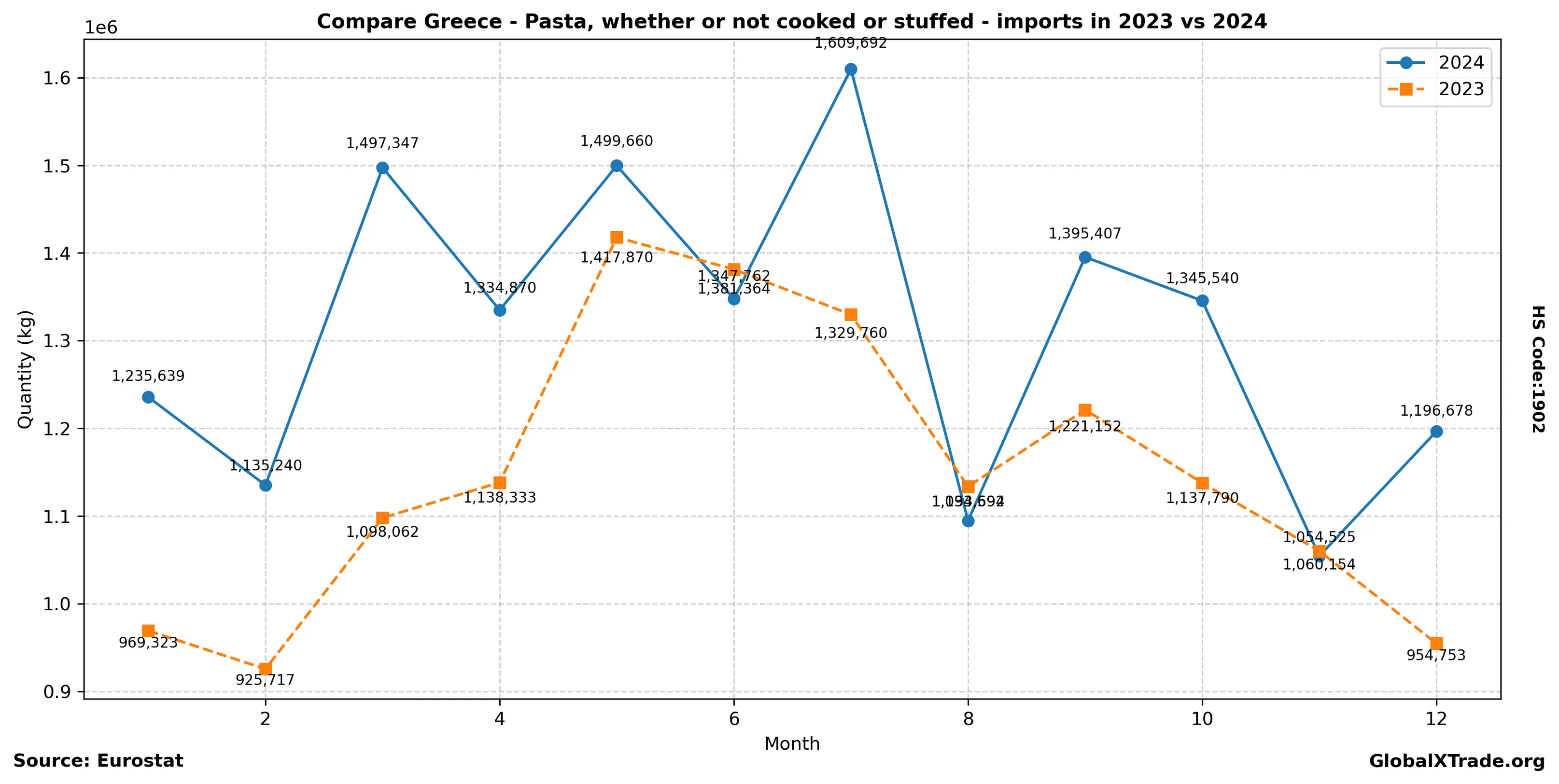 • Greek imports of pasta rose by 5.1% in the first quarter, driven by seasonal demand.