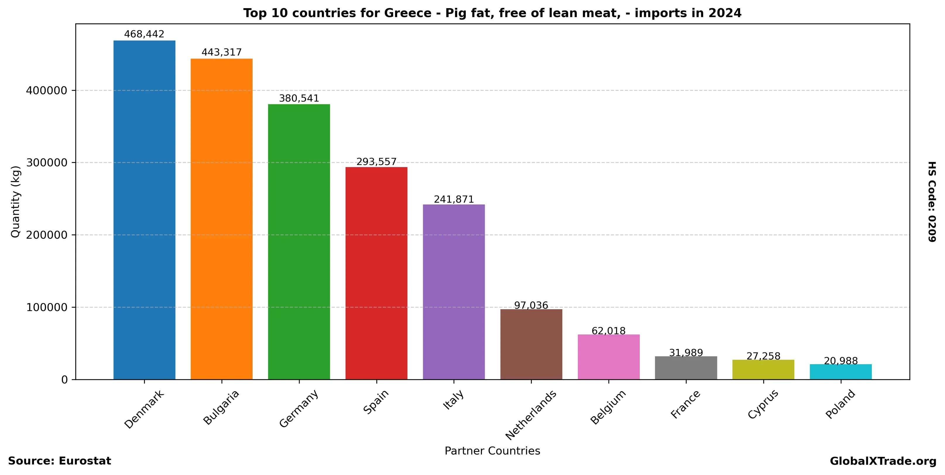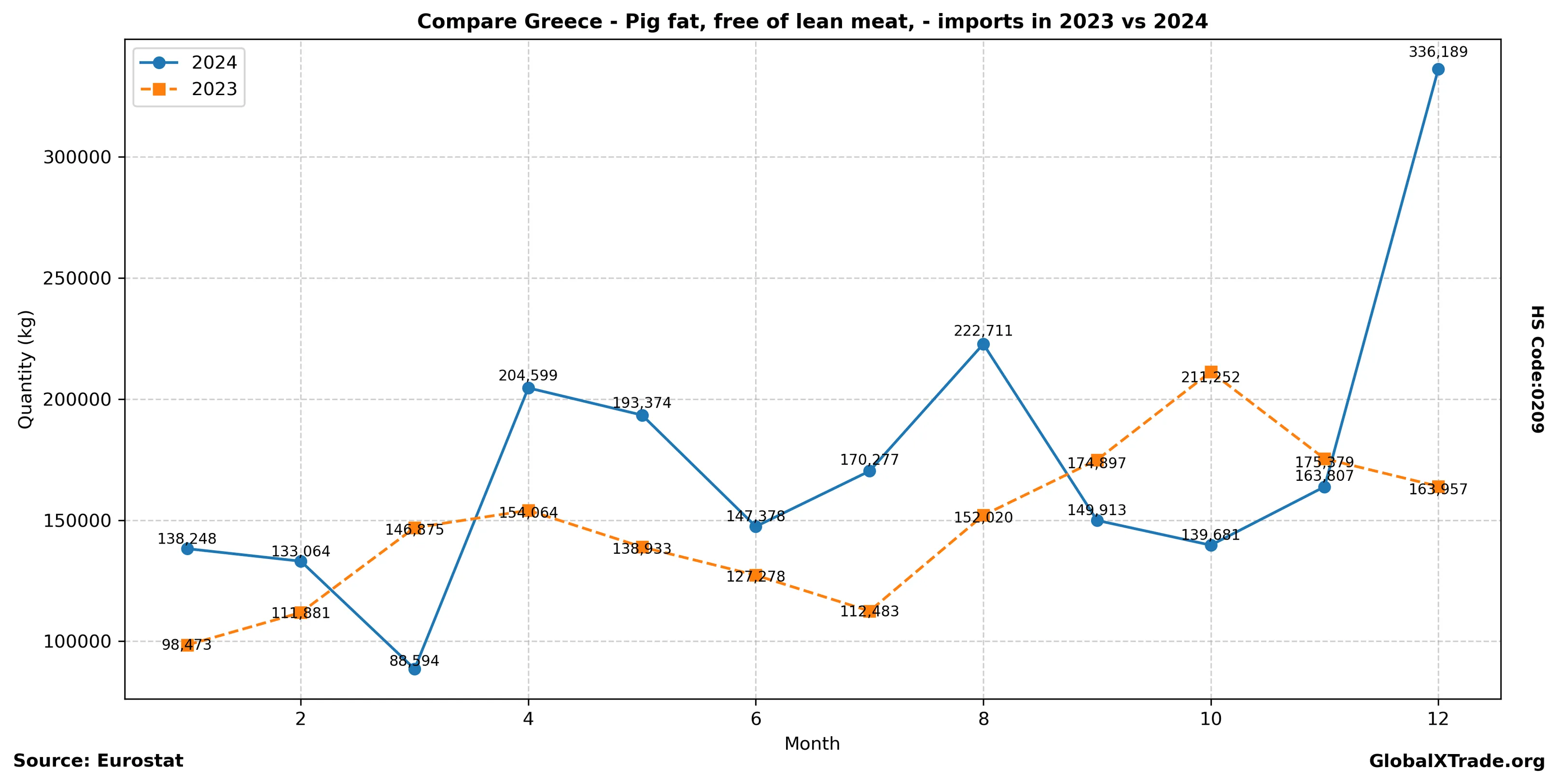 Greece’s imports of pig fat, free of lean meat, have shown some volatility recently due to shifting market trends. A rise in global pork prices has led to increased competition from other European countries, affecting demand for Greek processed meat products. Meanwhile, the country’s agricultural sector continues to face challenges related to disease outbreaks and changing weather patterns, impacting domestic supply chains.