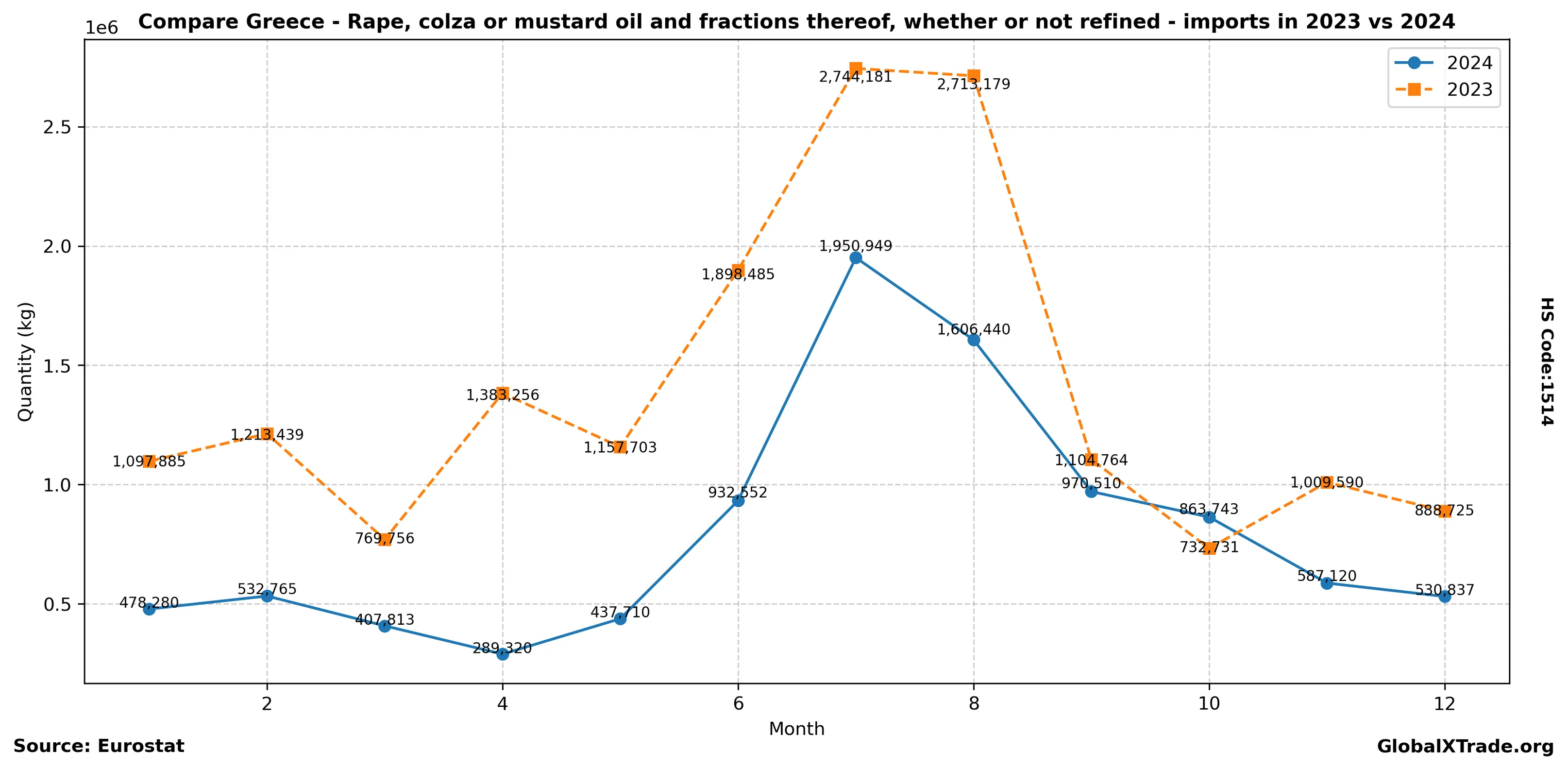 A surge in Greek imports of rape/mustard oil reflects shifting global market dynamics. As global production increases, Greece is taking advantage of lower prices and rising demand from its food processing sector. The country’s import growth has outpaced regional averages, driven by a 15% year-over-year increase in June. Market analysts expect this trend to continue as European demand for vegetable oils remains strong.