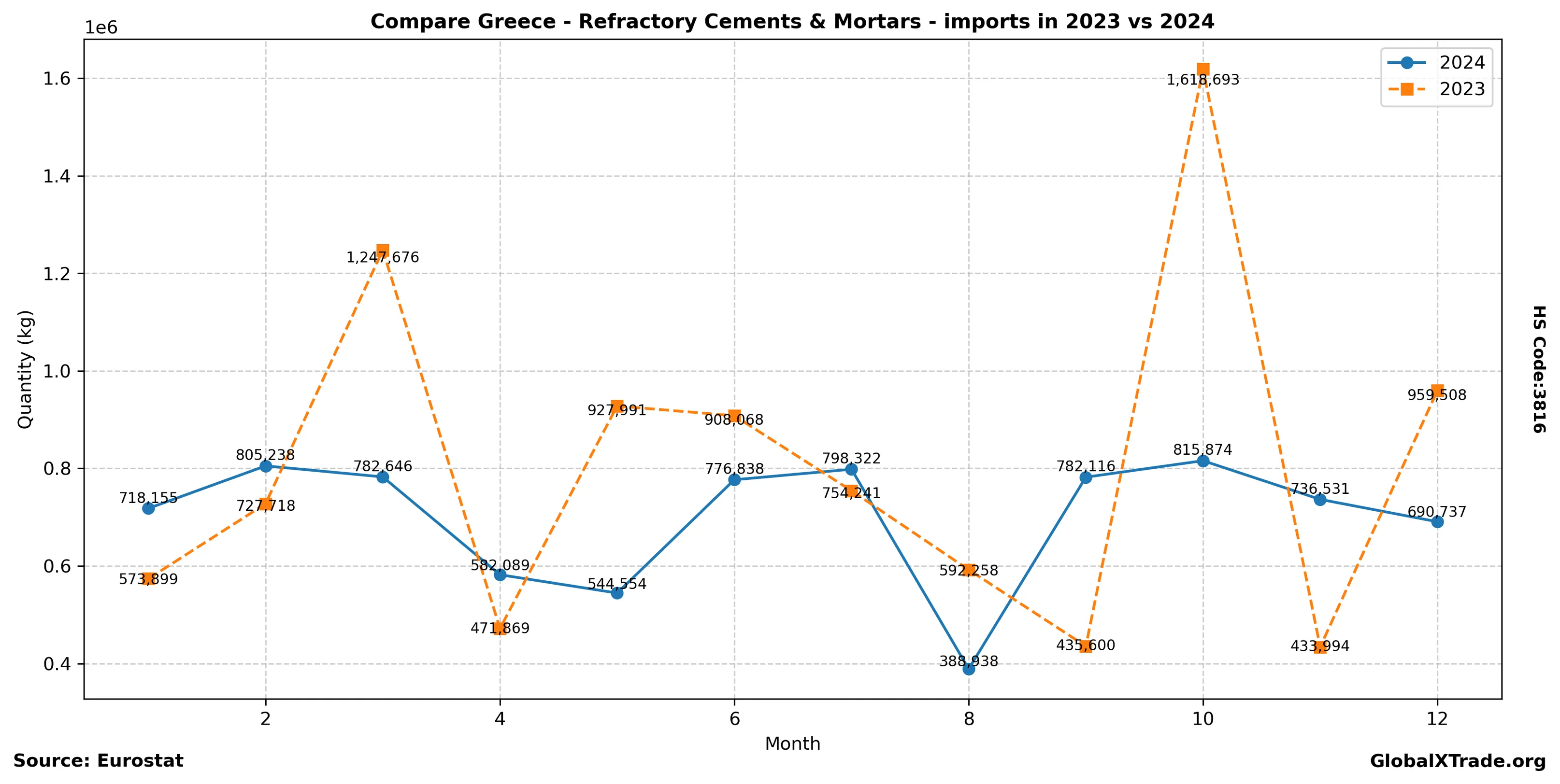• Greek imports of refractory cements (HS Code 3816) increased by 15% year-on-year in the first quarter, driven by a surge in construction activity.