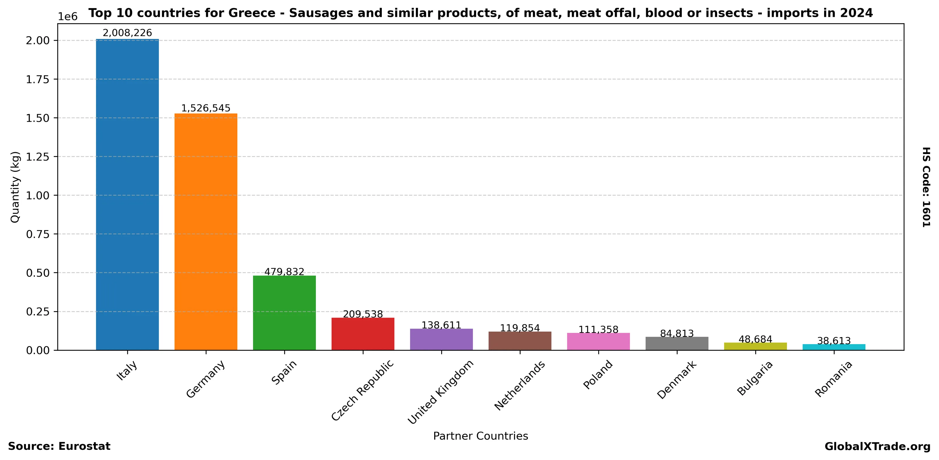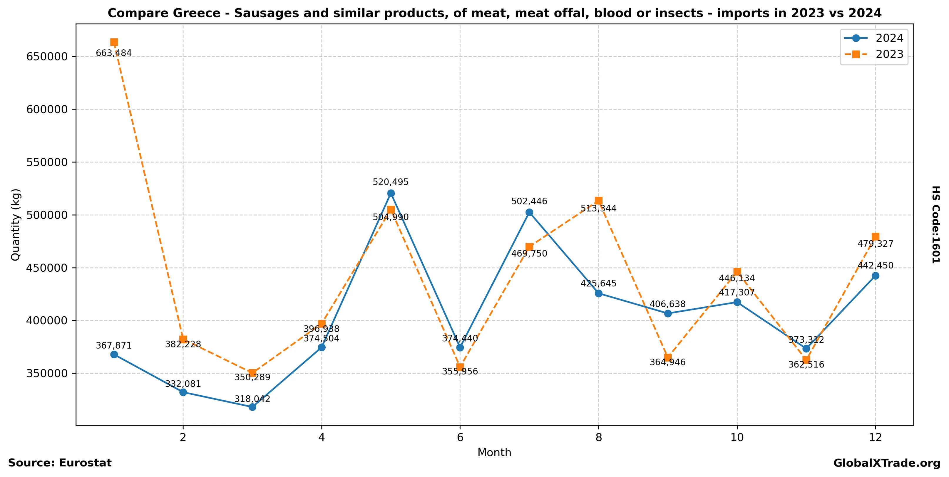 Greece “Sausages and similar products, of meat, meat offal, blood or insects” Imports in 2024