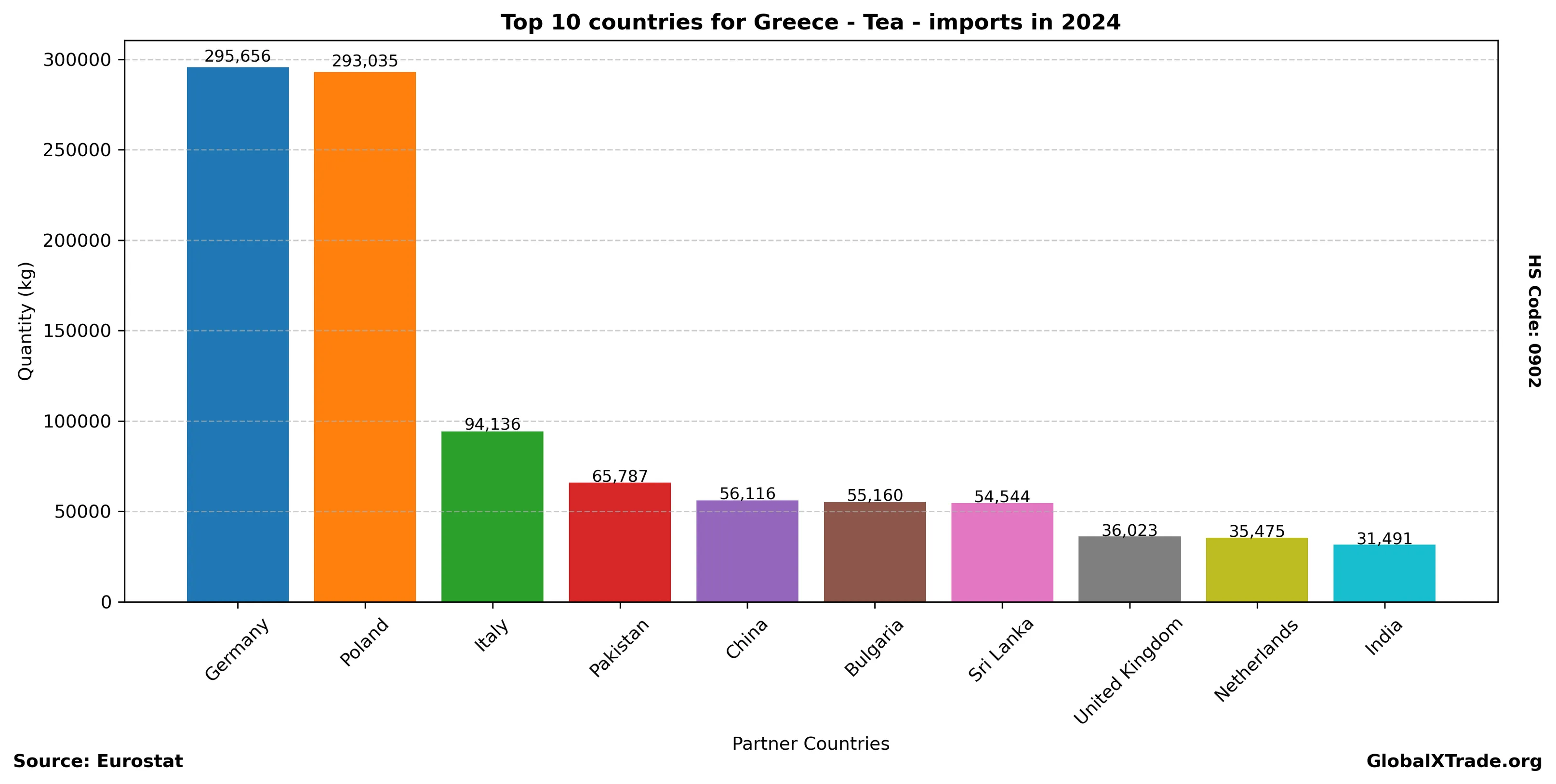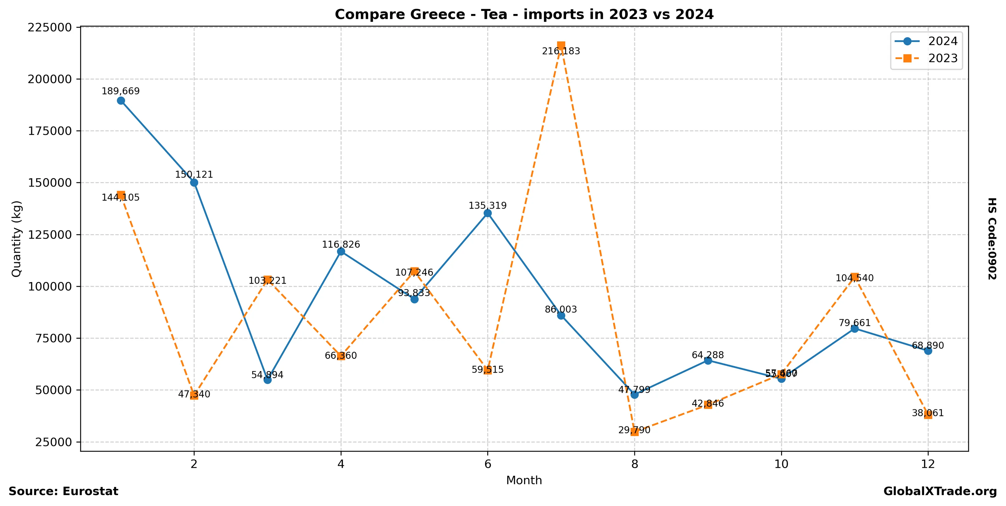 Greek tea imports continued their seasonal trend, reflecting a slight dip in June as local demand stabilized following a period of growth. Analysts attribute this stabilization to a general shift towards cooler beverages during summer months. Meanwhile, import prices for Greek tea remained stable, with an average price of $2.85 per kilogram.