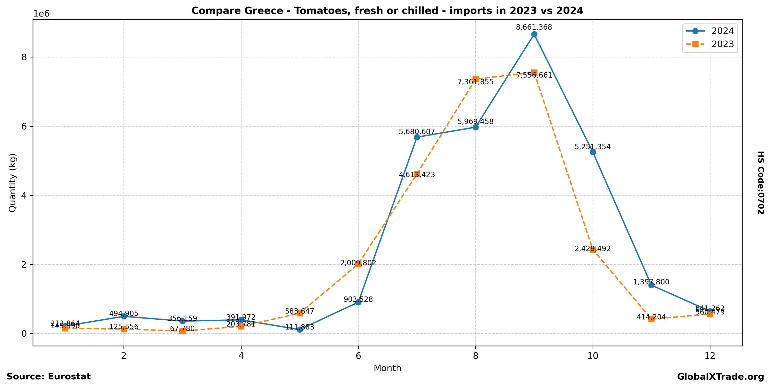 Greek retailers are taking advantage of peak season to stock up on fresh produce, including tomatoes, in anticipation of increased demand during the summer months. The country’s imports of fresh tomatoes from major suppliers like Spain and Italy have seen a notable uptick, driven by consumer preferences for locally sourced products during peak season.