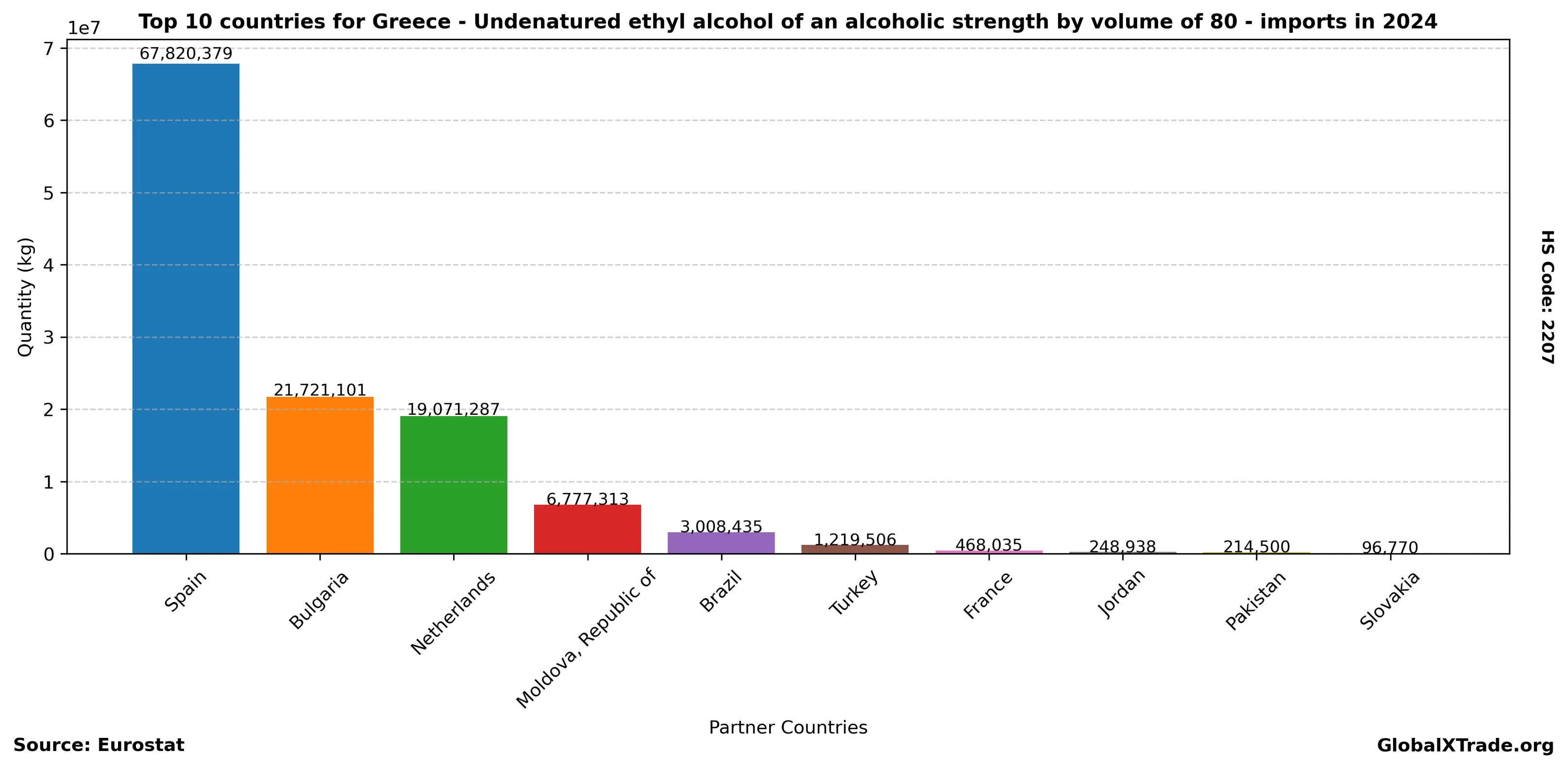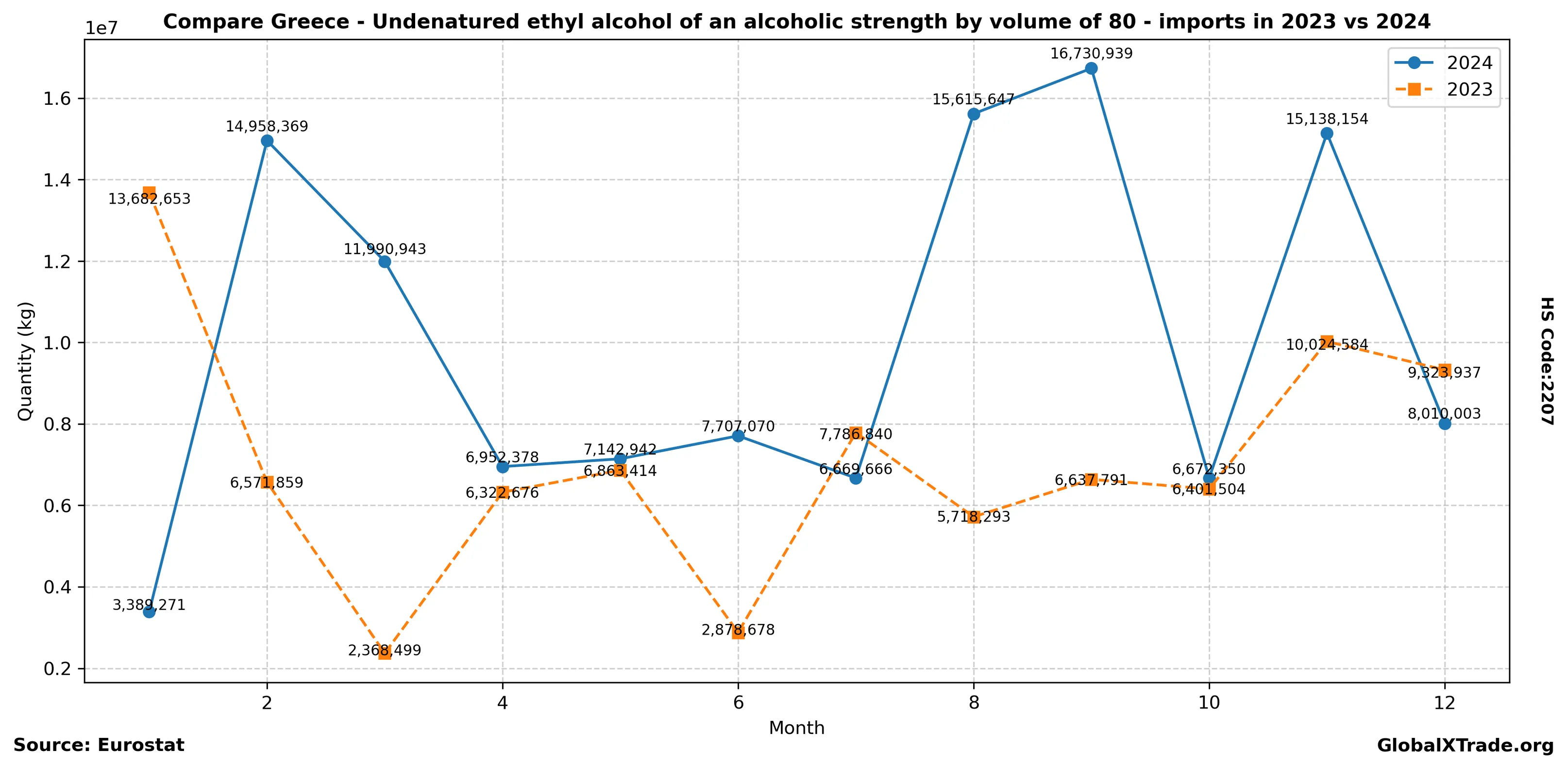 • Greek imports of undenatured ethanol (HS Code 2207) increased by 12% in June compared to the same period last year.