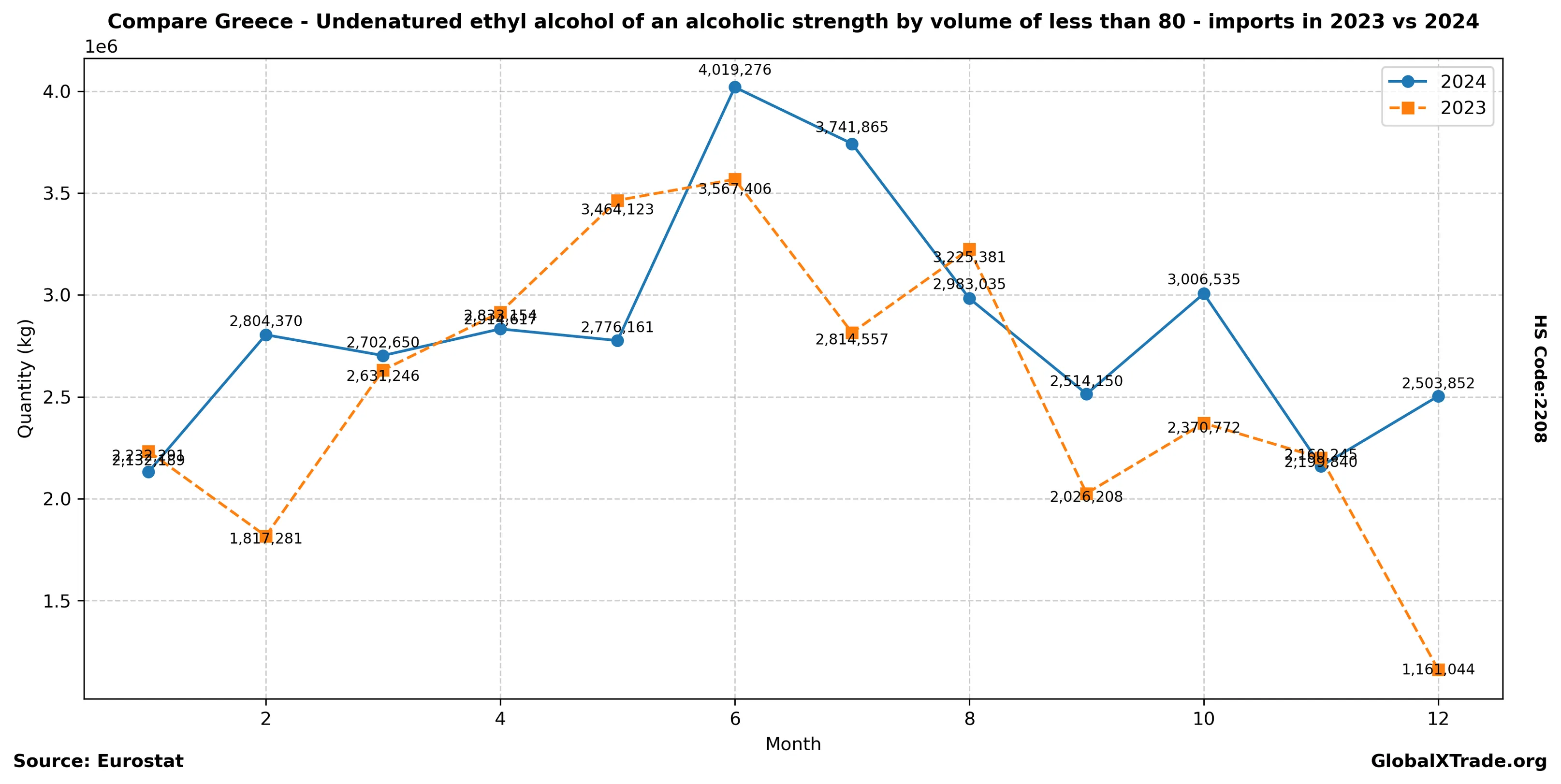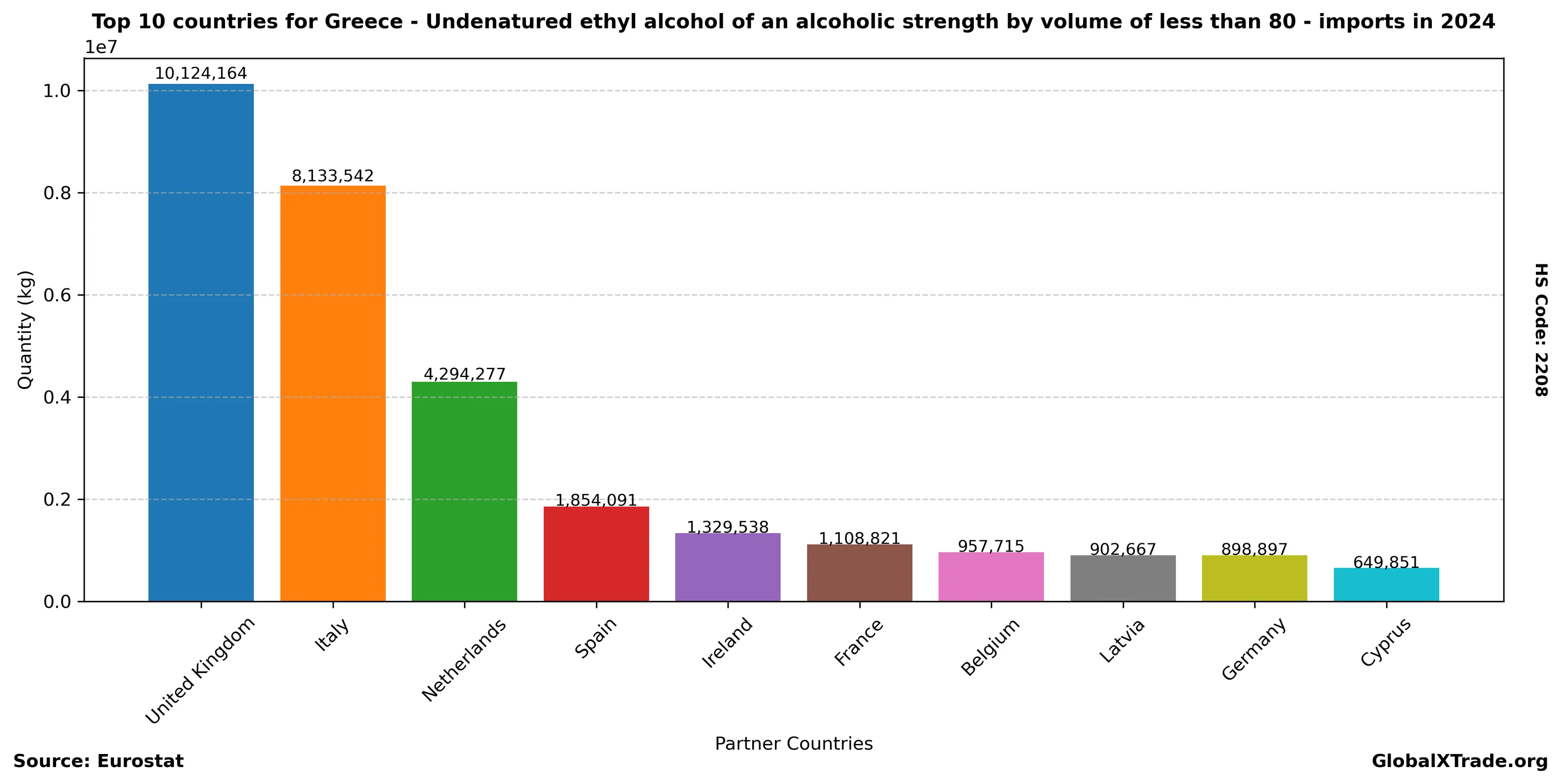 Greece “Undenatured ethyl alcohol of an alcoholic strength by volume of less than 80” Imports in 2024