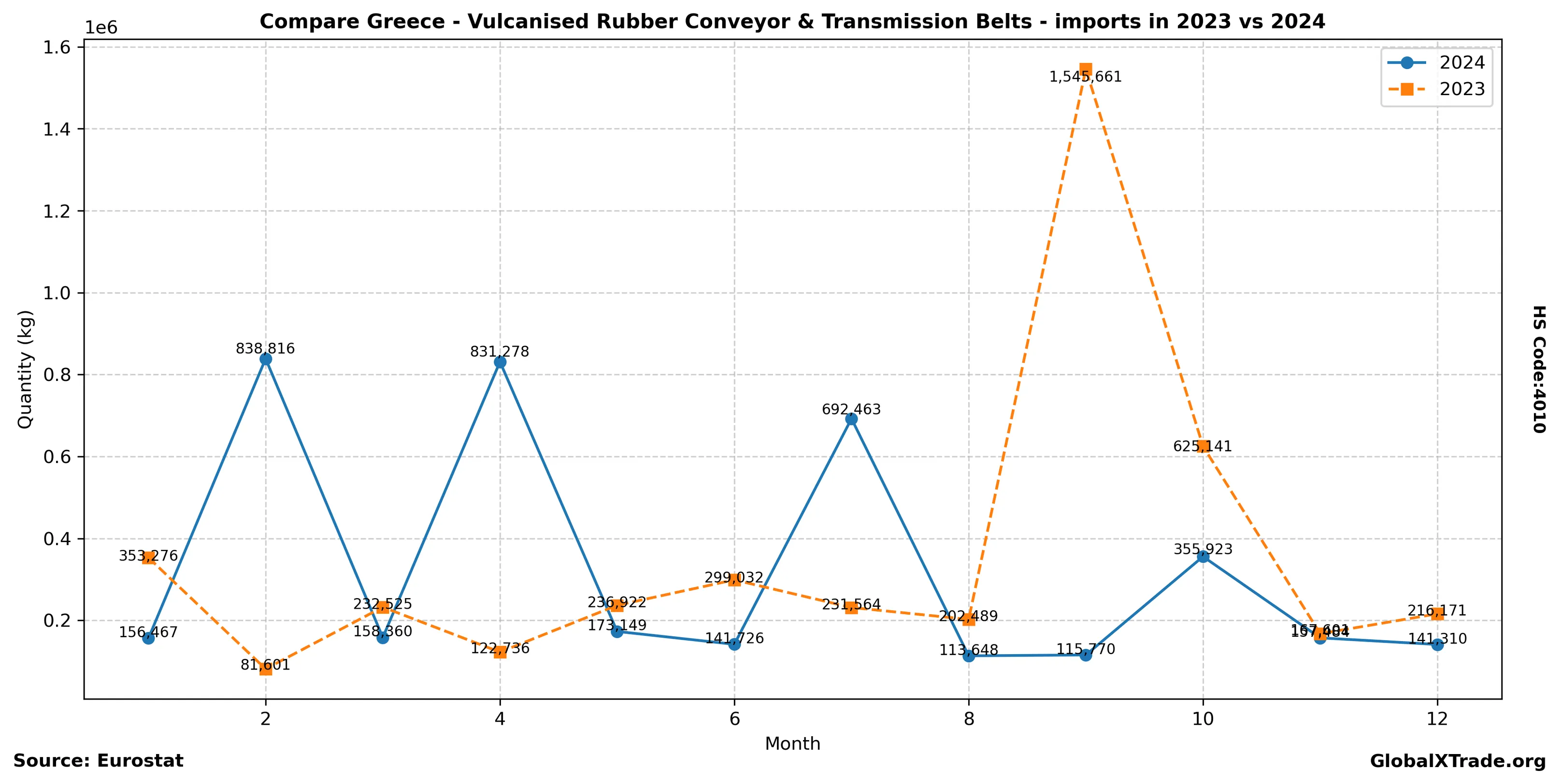 • Greek imports of vulcanised rubber conveyor and transmission belts rose 5.2% year-over-year in June, according to official data.