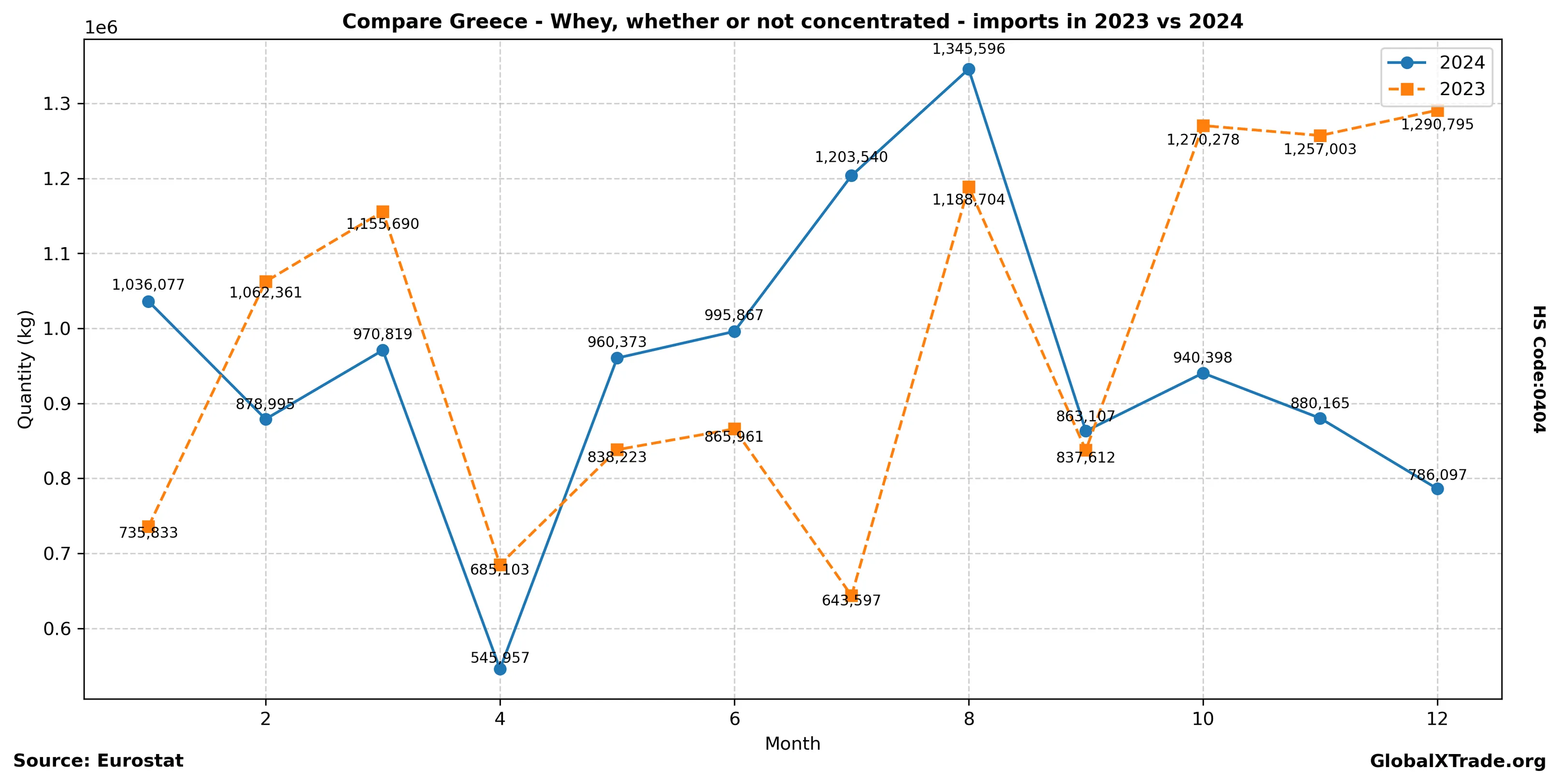 • Greek imports of whey (HS code 0404) increased by 8% to 15,000 metric tons in June compared to the same period last year.